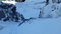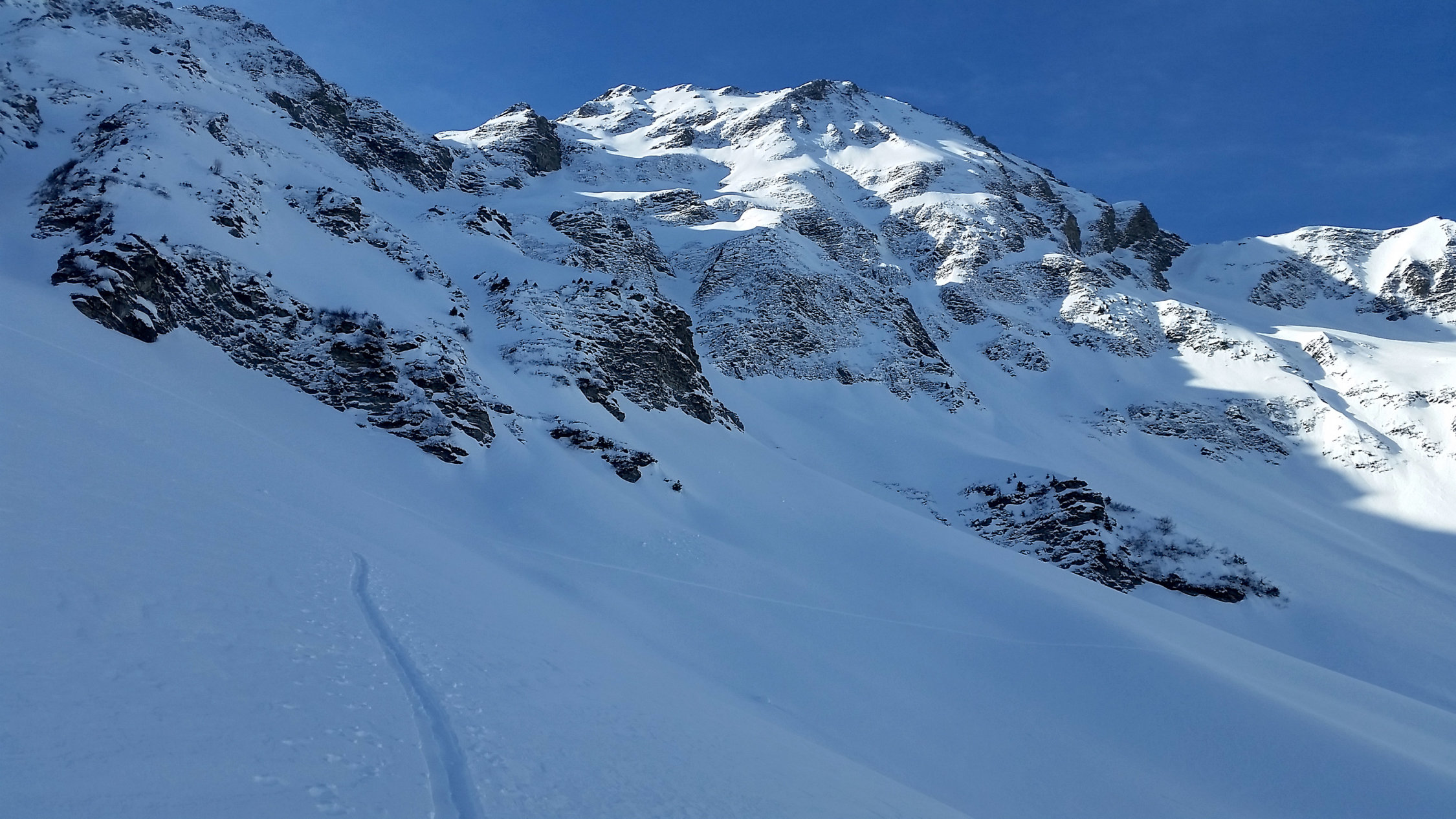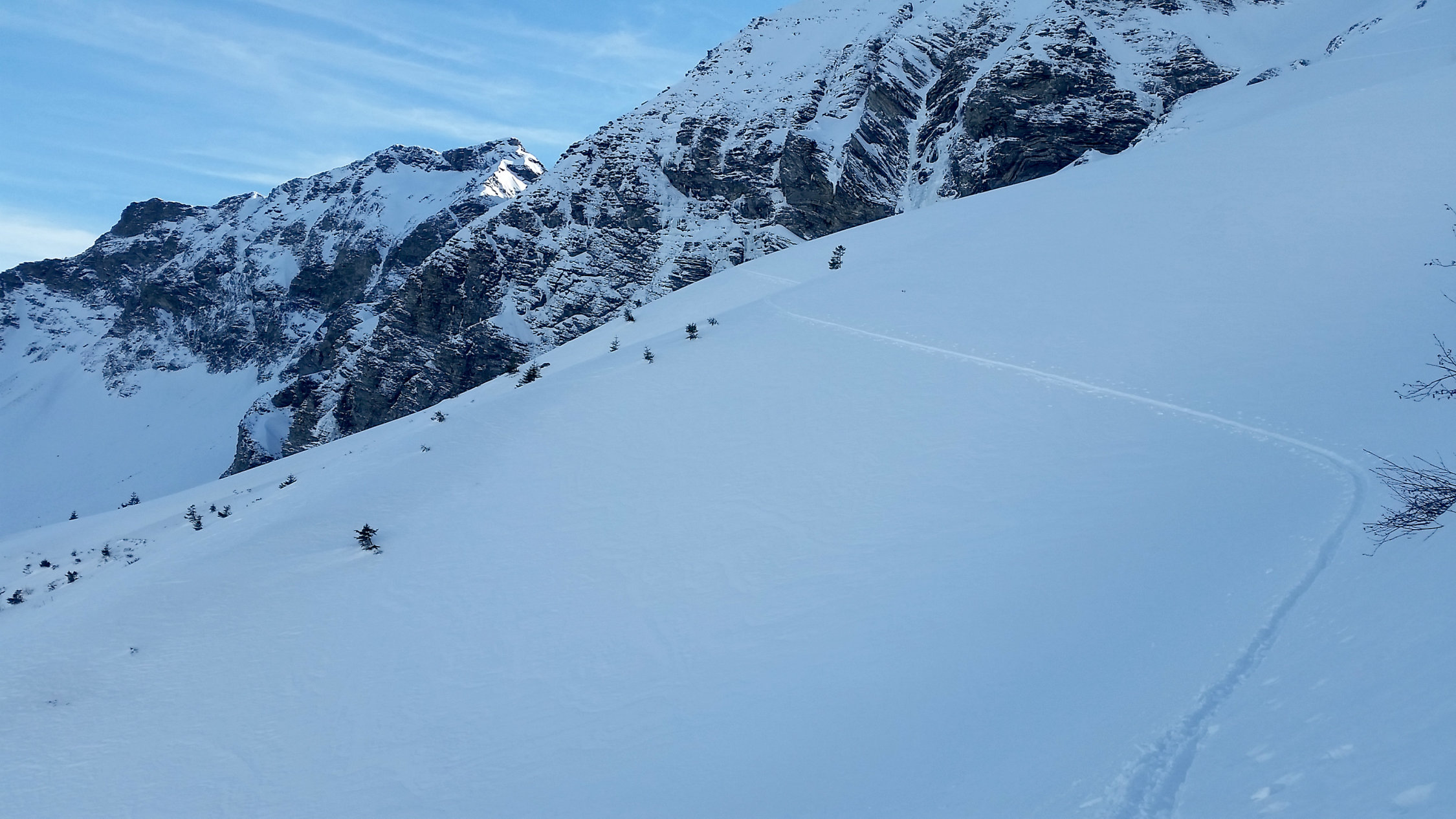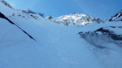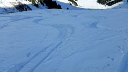 Im Wasserfall / Wysse Schopf ca 80m Ski tragen (Skischuhe lassen sich problemlos in den weichen Schnee schlagen, keine einzige Stelle vereist), sonst überall gute Spur zum Hochfellen, Harsteisen blieben im Rucksack.