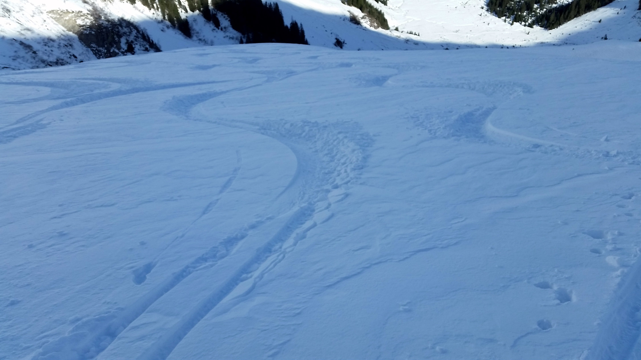 ..unglaublich: 10-40cm weichen Pulverschnee auf dicker Unterlage ab Hinterster Chirel bis oben, phasenweise leichter Pressschnee, aber wedelbar (siehe Bilder :)