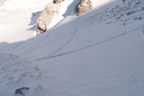 Eine der Rinnen wurde heute von oben befahren. Ich bin durch die linke Rinne nur aufgestiegen und weiter traversiert zum nächsten Gipfel und runter durch die Nordabfahrt von Pt. 2067 und weiter zum Arnihaaggen.
