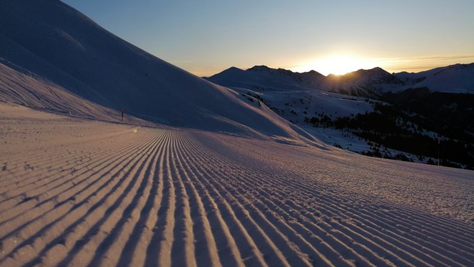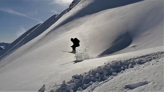 Pulverschnee, an den Gipfeln vom Winde bearbeitet.
