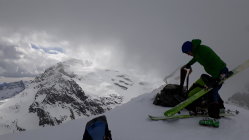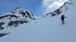 Unten schon sulzig, dafür brauchten wir oben Harscheisen. Auf der ganzen Tour überall verschiedene nervige Schneegebilde. In der Abfahrt haben wir eine nette Rinne, die der Wind blankgefegt und die Sonne aufgefirnt hatte, erwischt. Danach folgte stumpfer Sulz.