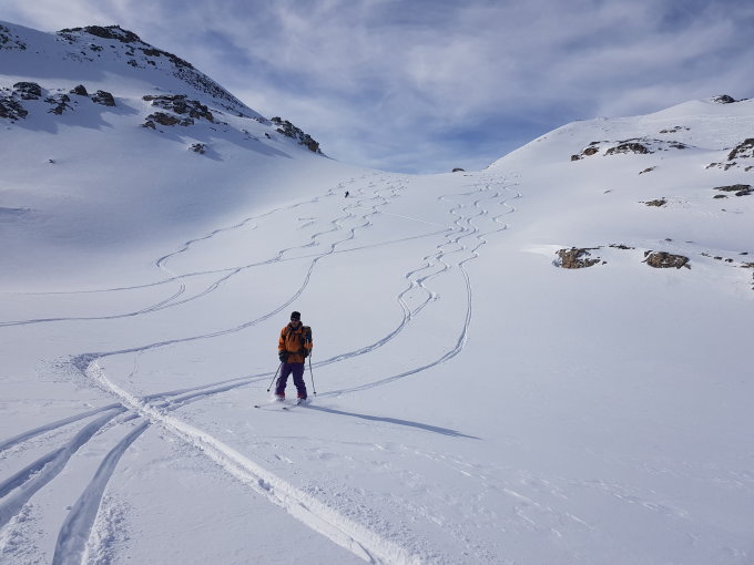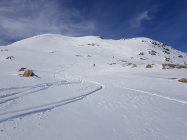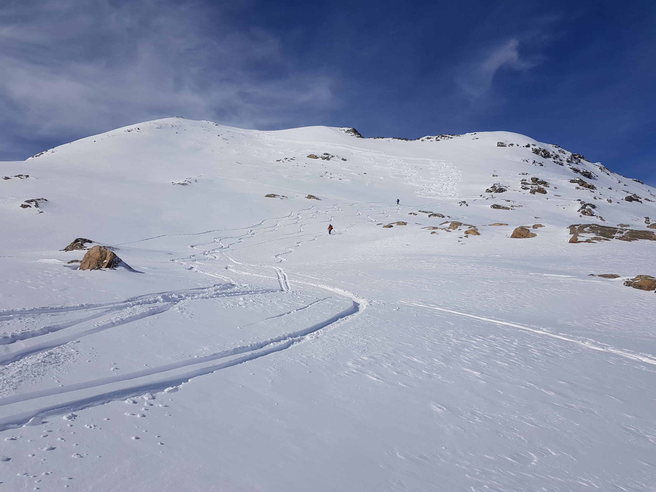 Wir haben uns kurzfristig entschlossen, anstelle des Fussaufstieges auf den Gipfel des Piz da L'Hom den namenlosen Westgipfel des Piz Punt Ota zu besteigen (wir haben ihn nach dem Bergführer "Piz Roger" getauft). Ganz oben gab es ein paar Steine, denen man gut ausweichen konnte. Die Abfahrt war dann bis weit hinunter ein Pulver-Genuss. Auf dieser Höhe gab es in der Vornacht wesentlich mehr Niederschlag (ca. 15-20cm) als im Tal (ca. 2cm).