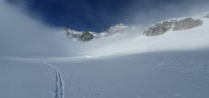 Gletschertor am Einstieg Tiefengletscher fast vollständig zugeblasen. Querung oberhalb Tätsch recht hart, Gipfelanstieg problemlos.