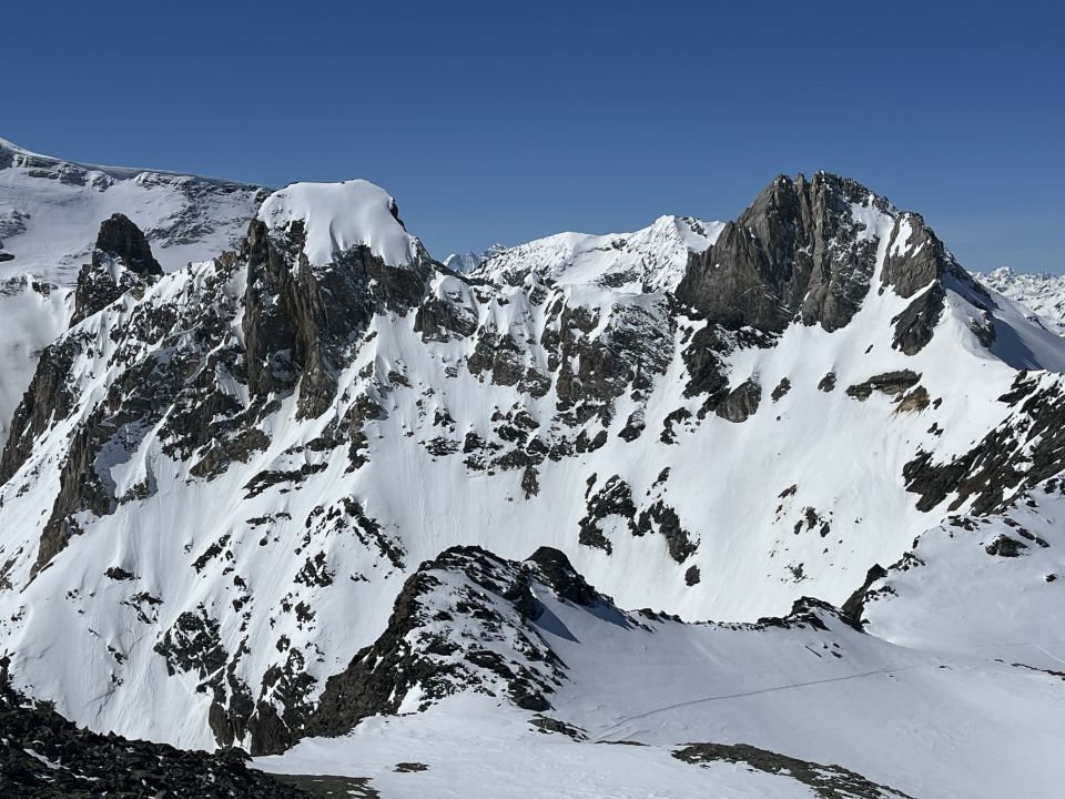 Abstieg meist angenehm aufgesulzt, nur sehr punktuell mit Durchbrechen. Das schöne Nordcouloir ist im oberen Teil nicht einladend, es kommen steile Felsen zum Vorschein. Möglicherweise ist diese Route wegen Gletscherschwund generell nicht mehr möglich.
