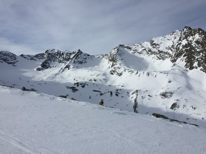 Aufstieg zum Becken des Zischgenferner auf harter Harschkruste, der Schnee im Becken des Ferners von Wind gezeichnet. Die Sicherungsseile im Aufstieg zur Zischgenscharte und weiter zum Gipfel sind fast durchgehend schneefrei. Harscheisen - und für den Gipfelaufstieg auch Steigeisen - sind hilfreich.