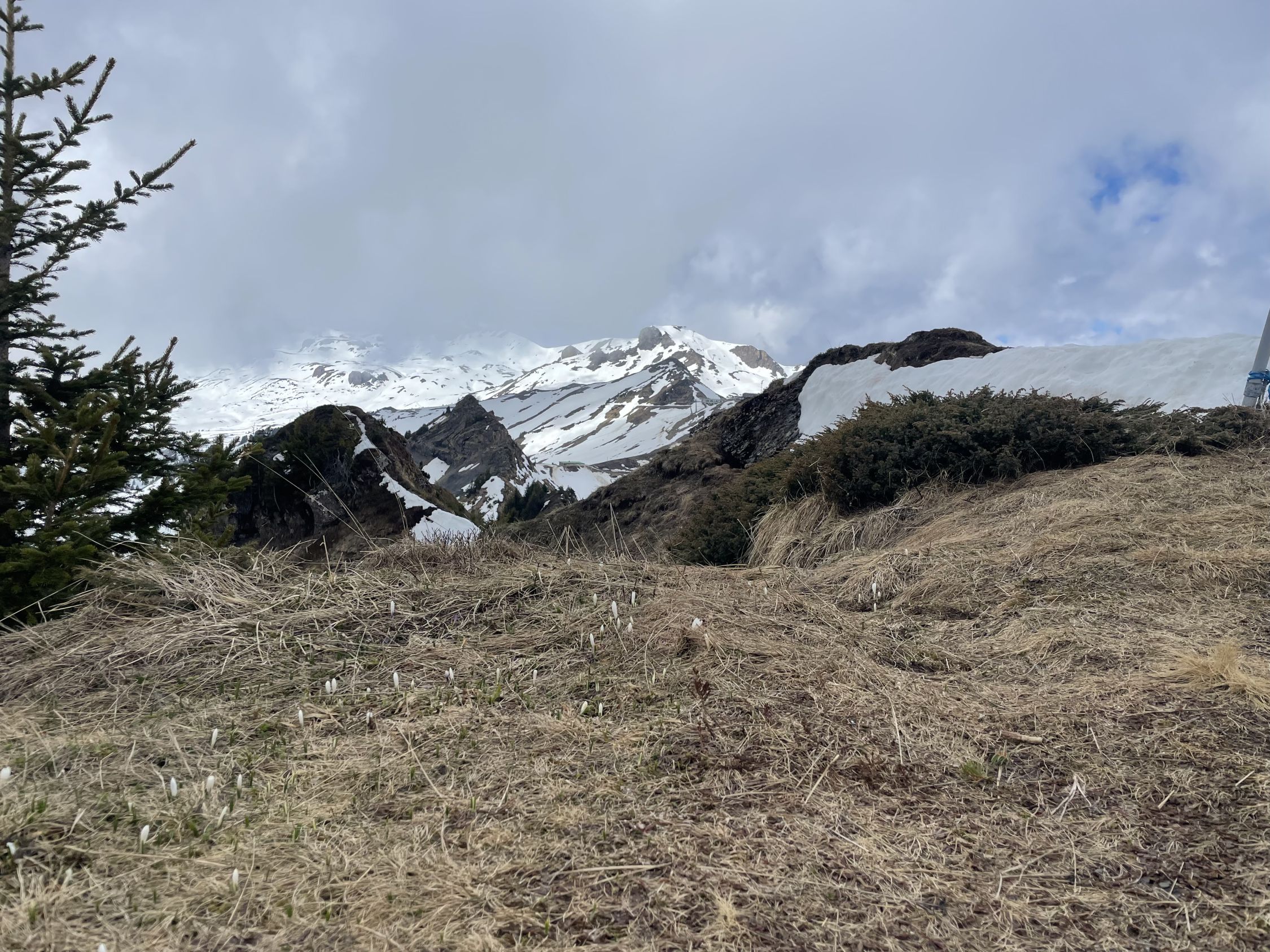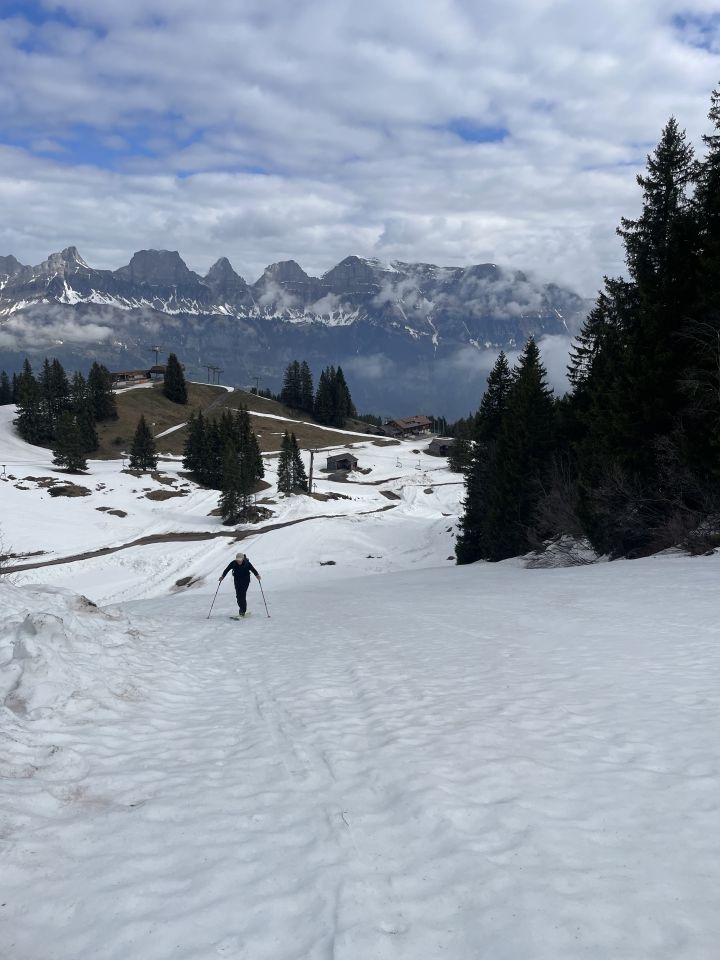 „Als Skitour vor oder nach der Saison zu empfehlen“, steht in der Routenbeschreibung, und das trifft voll zu. Heute war von unten bis oben Nassschnee, in der bewölkten Nacht hatte es nicht abgestrahlt. Aber da man sich bis fast oben auf den alten Kunstschneepisten bewegt, war der Abfahrtsgenuss trotzdem garantiert. Zur dunkelgrünen Höchstnote fehlte die Sonne, die schaffte es zwar im Laufe unseres Aufstiegs bis zum Leist, aber uns erreichte sie erst unten in der Abfahrt. Wir waren heute fast alleine, zwei Tourengänger gingen zum Maschgenkamm.