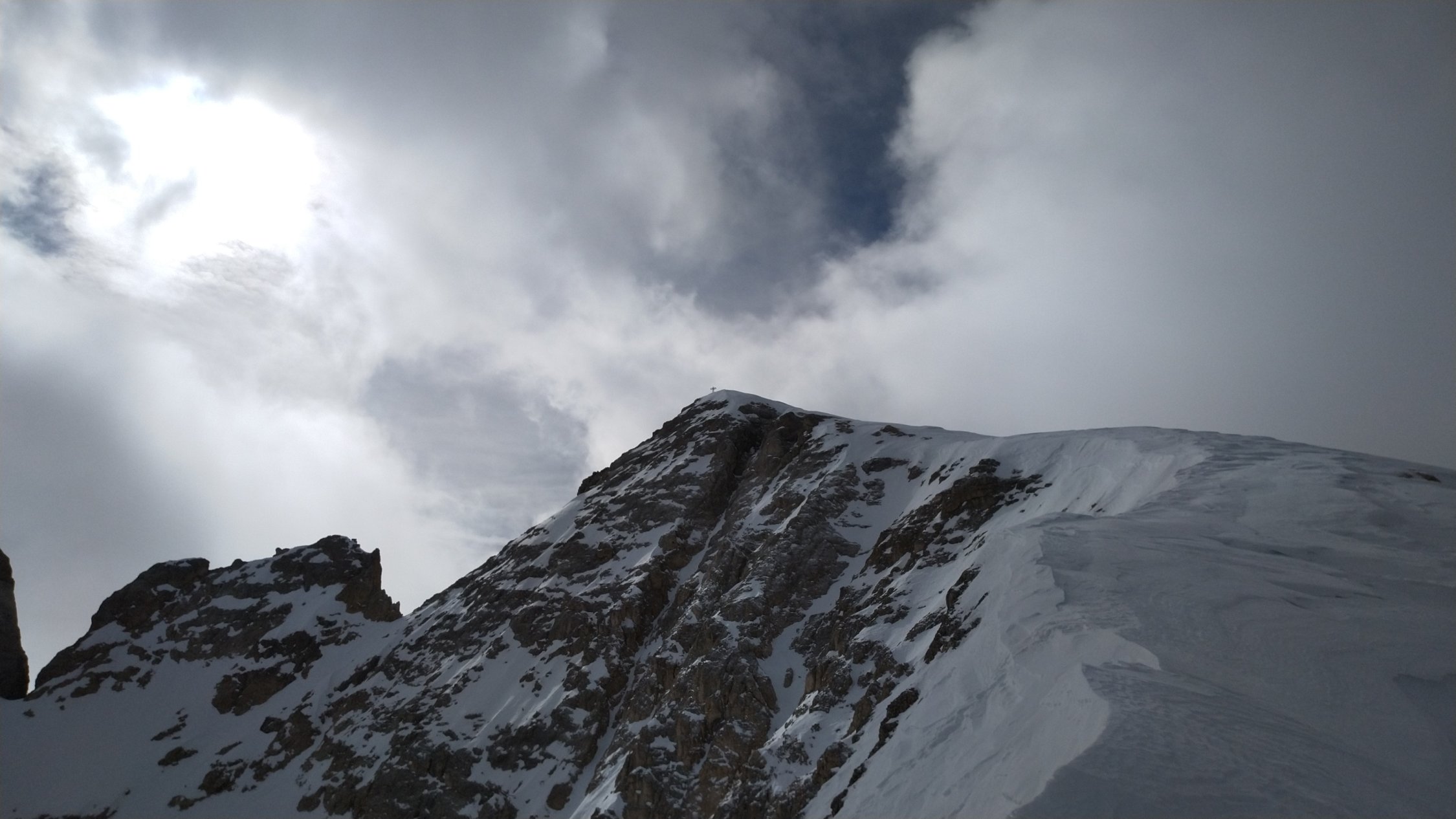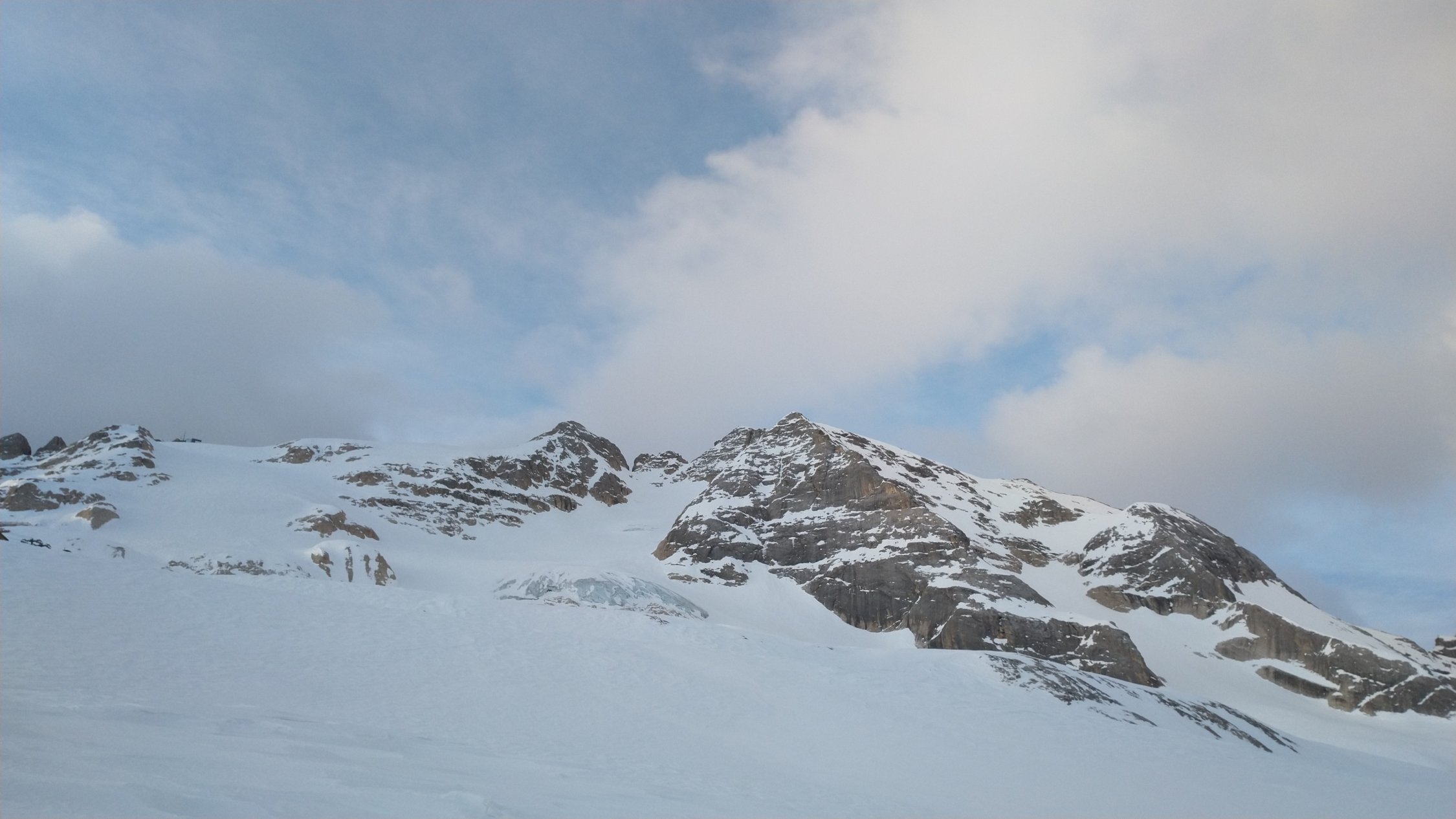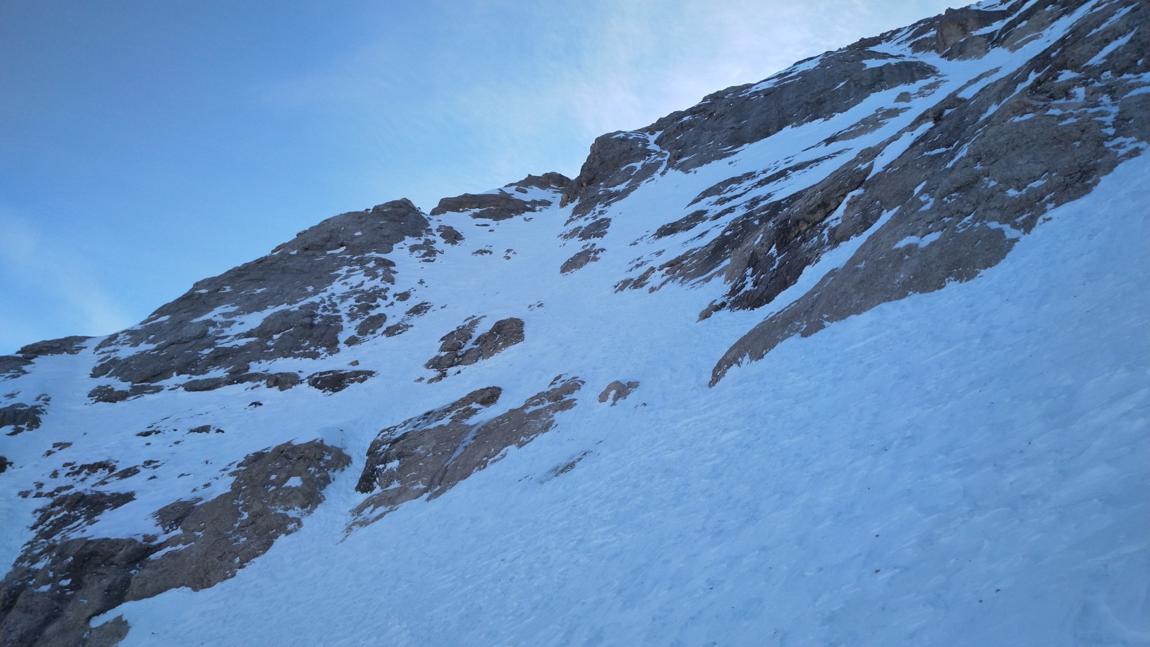 Die Verhältnisse waren für den Aufstieg fast ideal. Mit Ski bis zum Einstieg der Nordwand ohne Harscheisen möglich. Die Nordwand selbst komplett mit Firn bedeckt, mit Steigeisen kaum oder fast garnicht eingesunken.