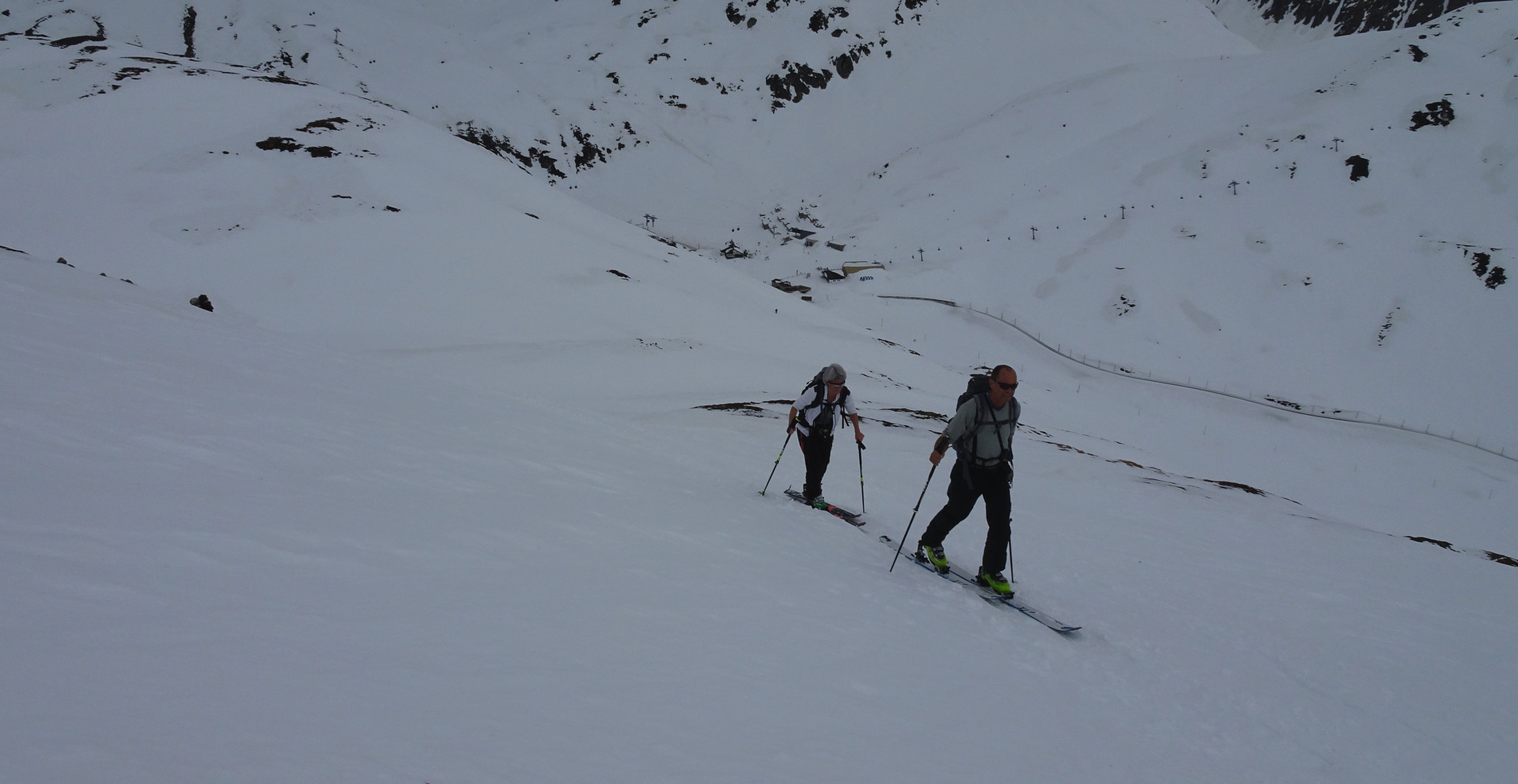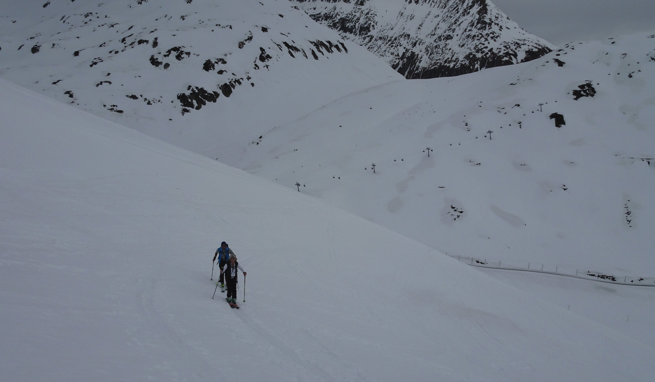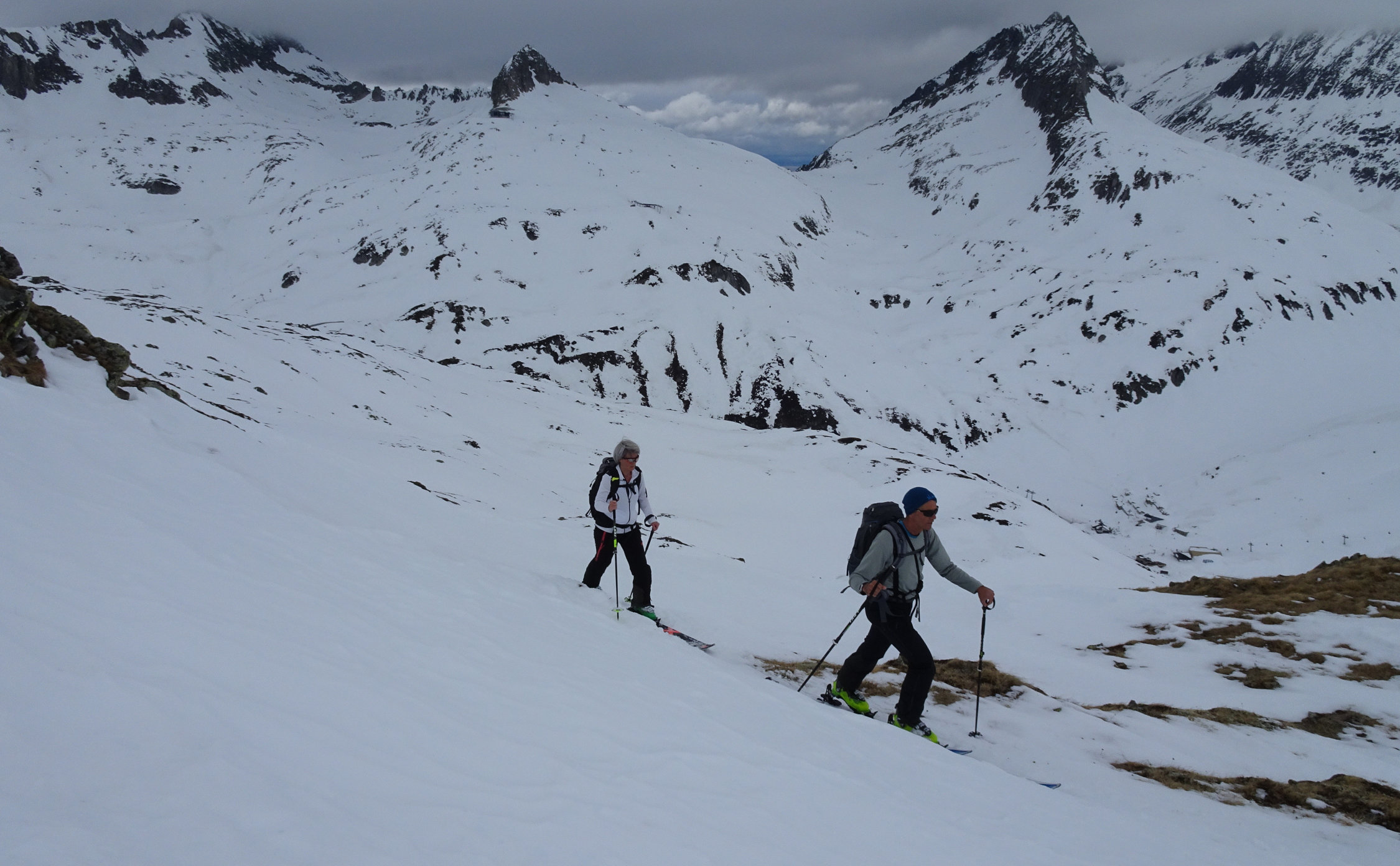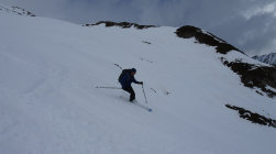 Wir sind am Anreisetag mit der RhB zum Oberalppass gefahren und erst um etwa 11 Uhr losgelaufen. Die Temperaturen waren von Beginn weg zu hoch, was sich dann in der Abfahrt durch die Osthänge Richtung Maighels auch zeigte. Es ging noch einigermassen gut, war aber wie Skifahren im Teig. Von der Schneemenge her gut machbar.
