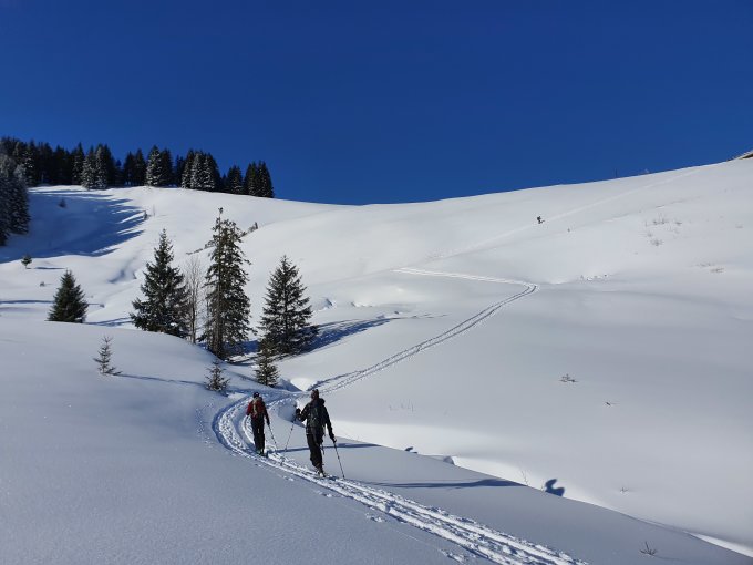 Schlusshang mit einem Deckel gespickt und eher wenig Schnee, via Weg aber gut abfahrbar.