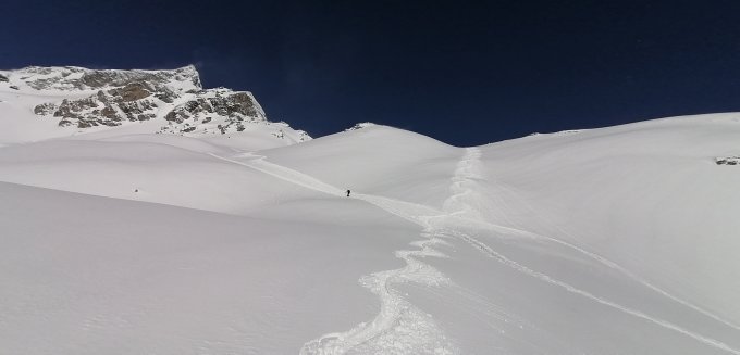 Letzte Schneflocken beim Start um 9.00 Uhr, Pulverschnee auf der ganzen Tour.