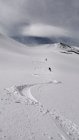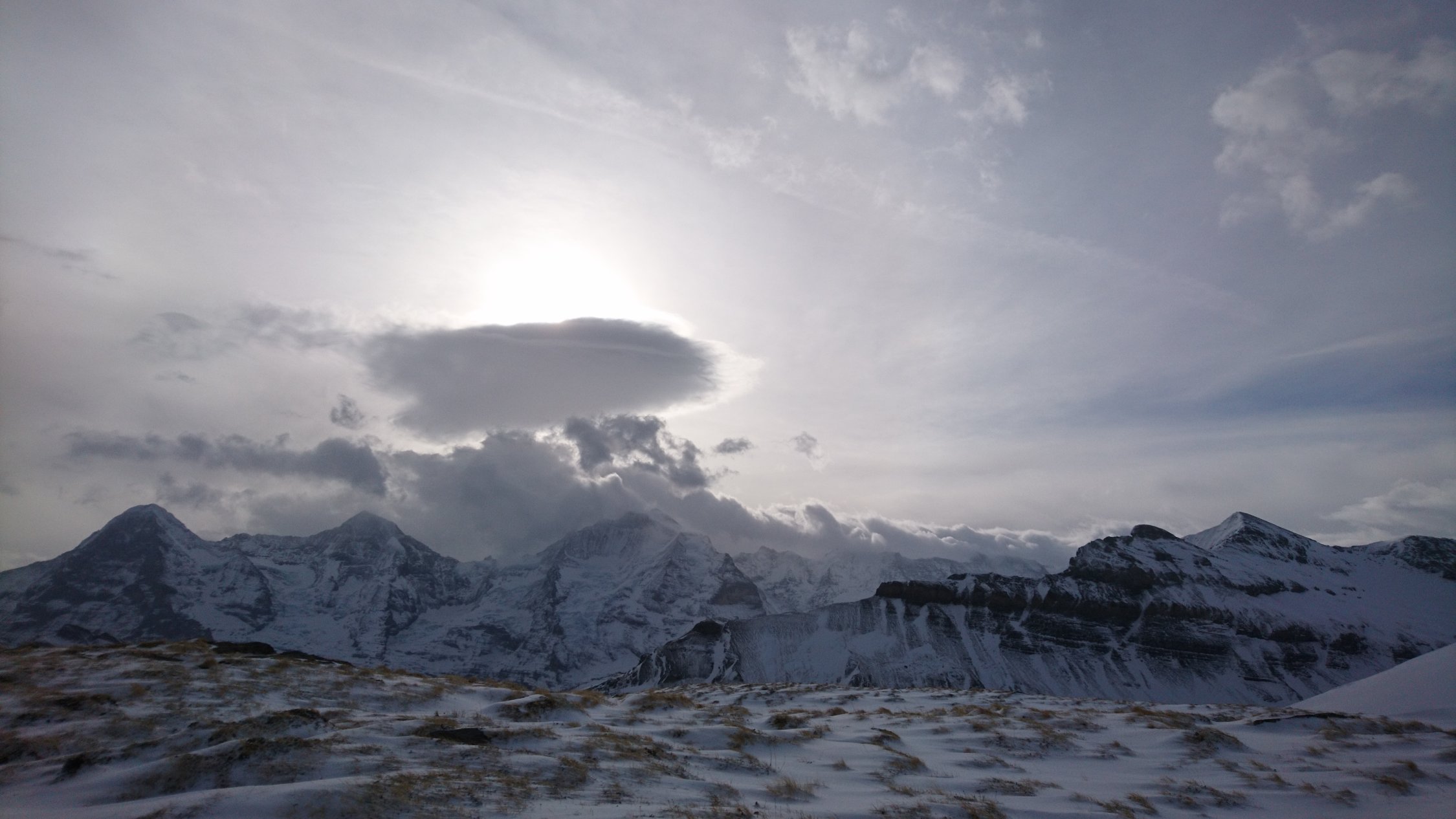 Ab Sousegg zunehmend windig, Schnee neigt zu Stollenbildung. Traverse unter Lobhörnern entlang einer alten Spur gut zu gehen. Dank Wolke über der Jungfrau noch nicht zu sehr aufgeweicht. Die Zwischenabfahrt ins Ürtscheli hätte sich allenfalls gelohnt.