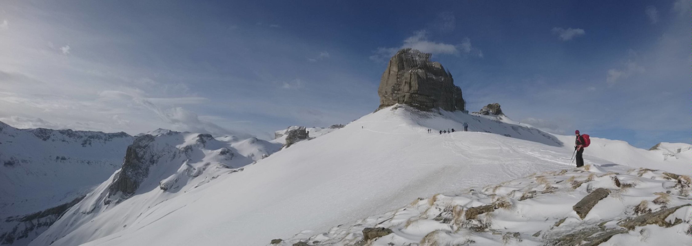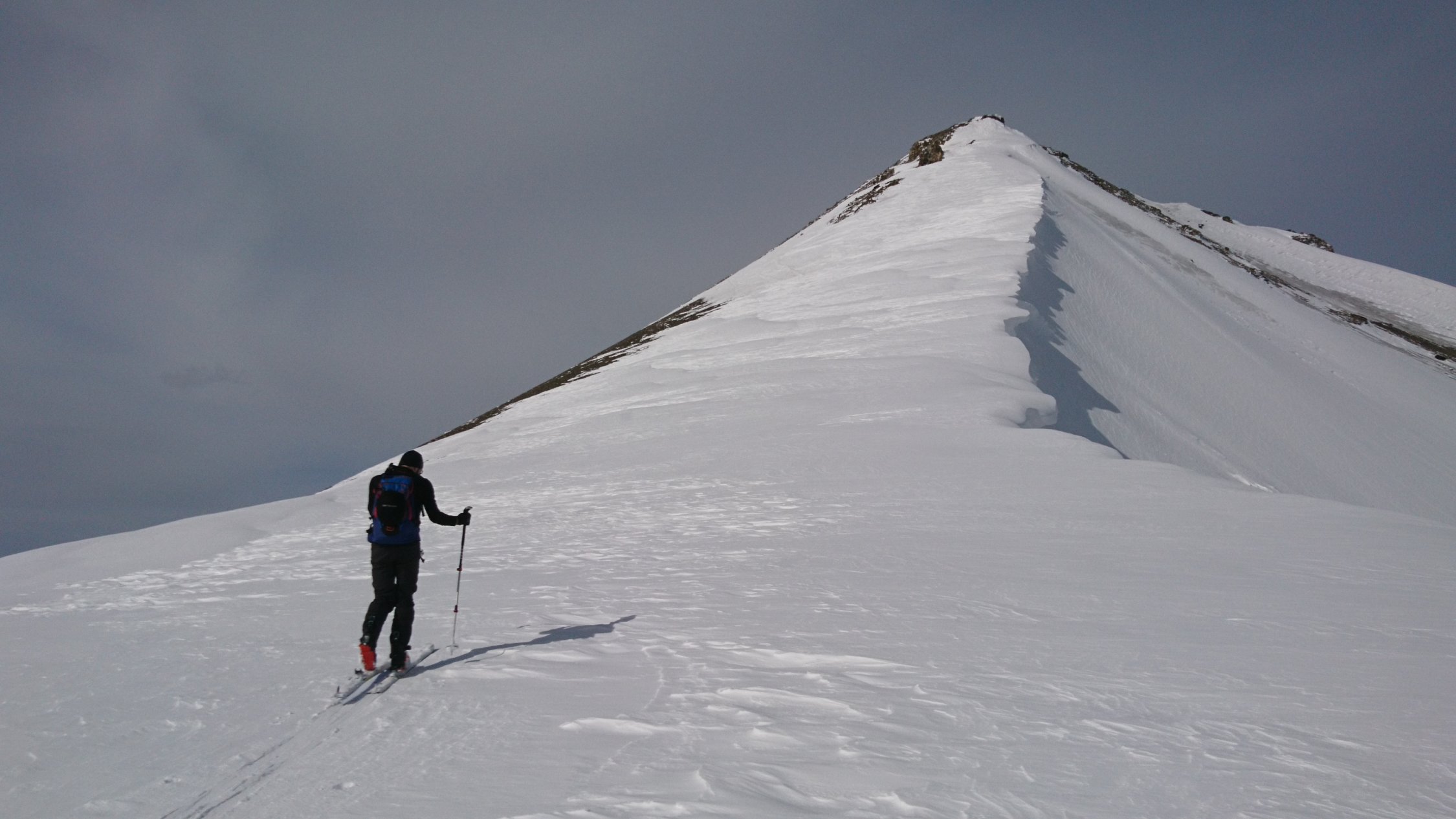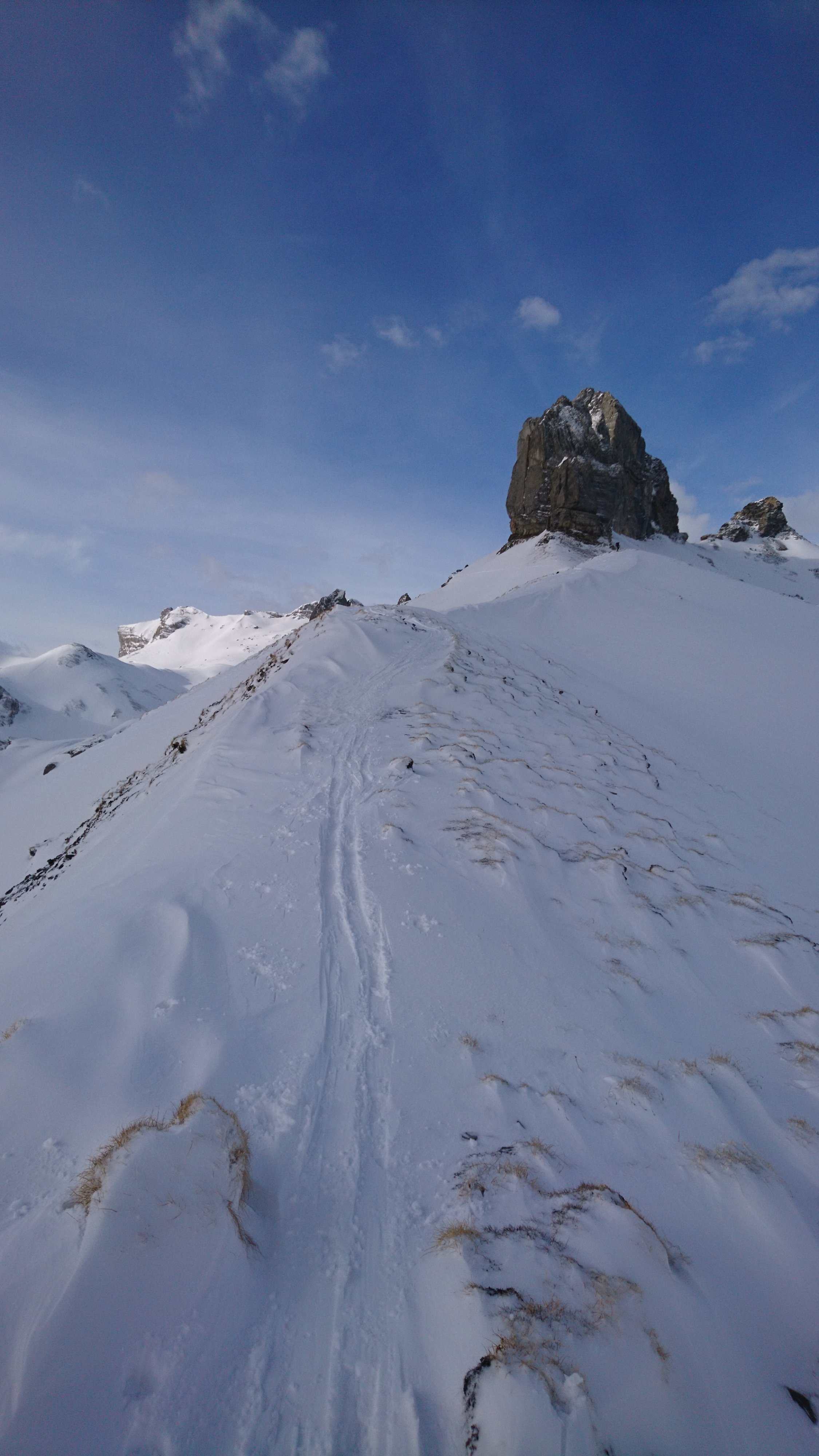 Am Gipfelgrat starker Südwestwind, hatte aber bis zum markanten Felsen genügend weichen Schnee für einen problemlosen Aufstieg.