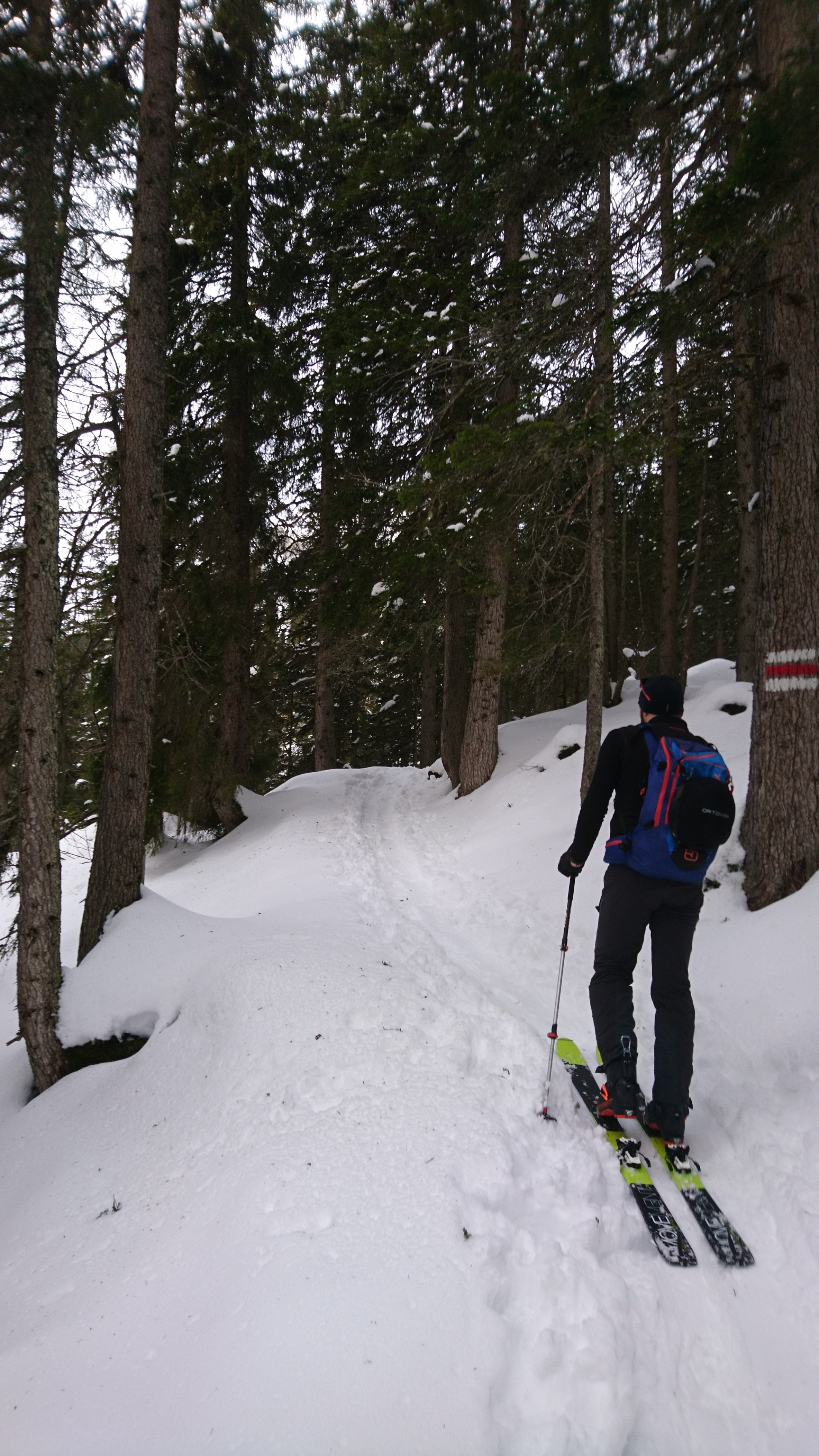 Start in Sulwald um 07:30 ohne Wind, Temperatur deutlich im Plus, von den Tannen tropft das Schmelzwasser. Waldweg sehr gut eingeschneit, wesentlich besser als erwartet, gute und griffige Spur.