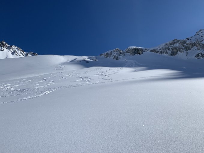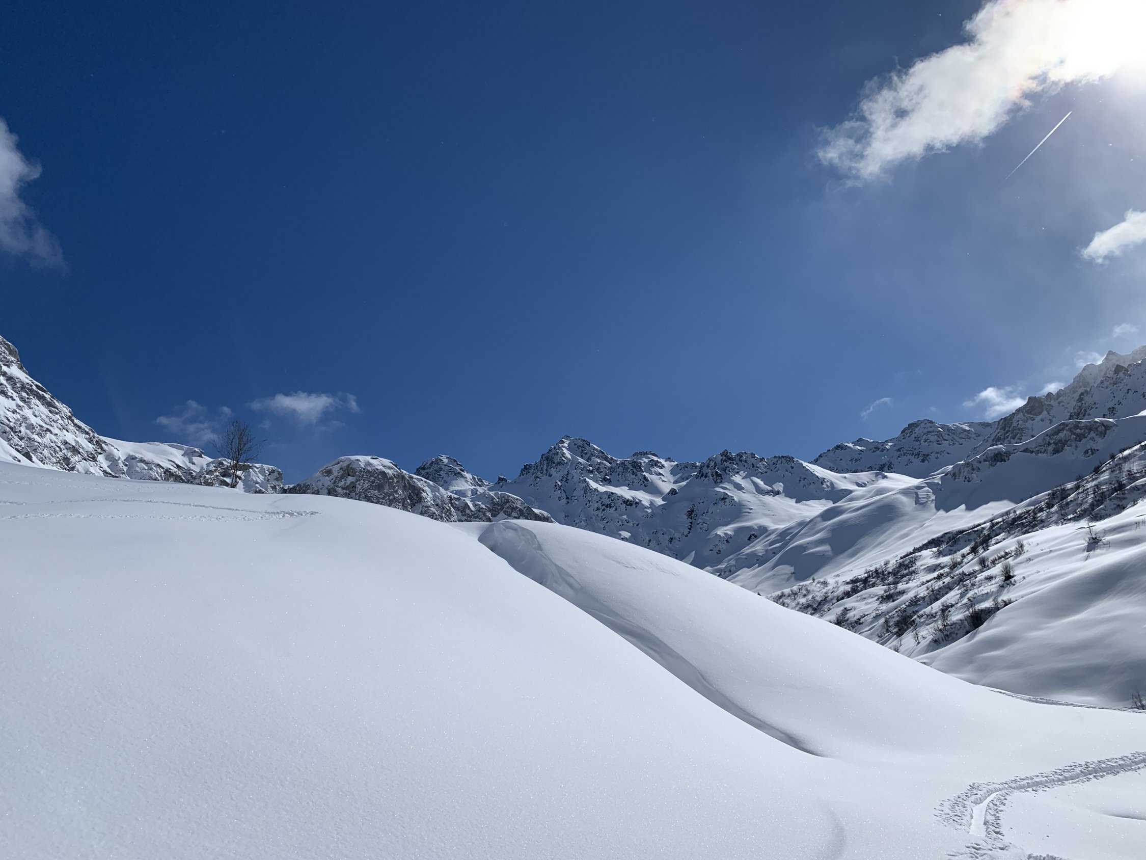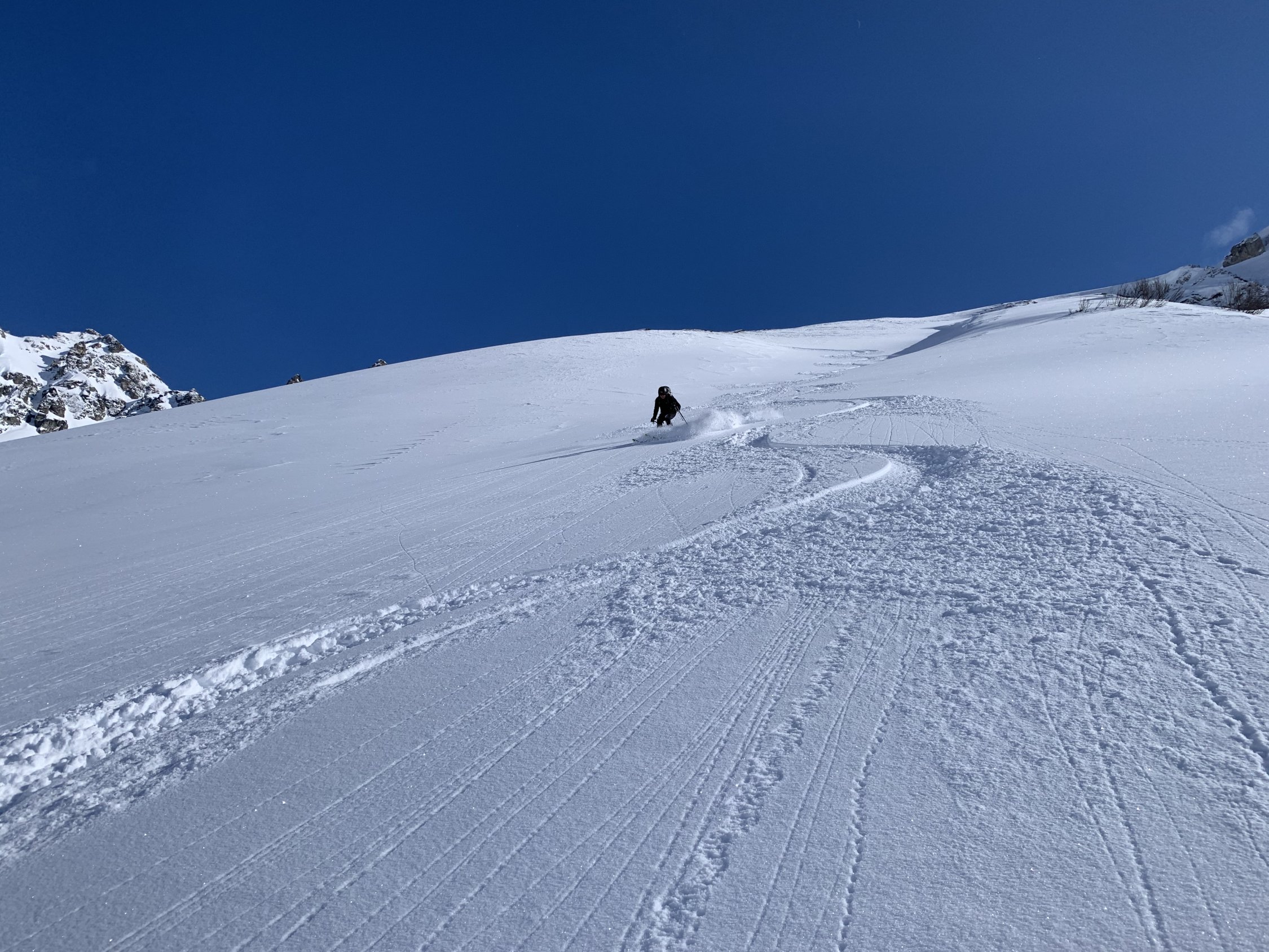 Wenn’s wärmer wird ist vorbei mit Pulver aber immer noch lohnend, genügend Schnee im Gebiet