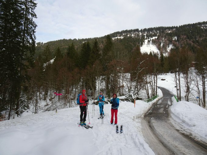 Schneelage erstaunlich gut. Während die Südhänge am Siplinger- und Heidenkopf schon wieder grünlich schimmern, ist hier noch reichlich Schnee vorhanden und selbst der Baumslalom im unteren Teil gut machbar. Sehr warm, daher kompakter und nasser Schnee, im unverspurten Gelände jedoch recht schön zu fahren.