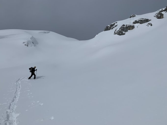 Nach dem Traumtag gestern, heute bei bewölktem Himmel auf die Schijnfluh. Immer noch guter Schnee, etwas gesetzter als gestern, je nach Exposition etwas gedeckelt, in Rinnen immer noch gut zu fahren. Sind wegen Föhnsturm 100m vor dem Gipfel umgedreht und haben noch eine schöne Abfahrt nach einem Wiederaufstieg genossen.