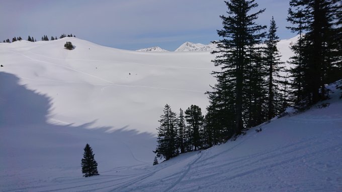 Aufstieg und Abfahrt: Bis auf Pöris 1724m nasser Neuschnee. Ab hier in guter Pulverschnee durch die Lindechäle. Auf dem gewellten Rücken Wind gepresster sehr schön fahrbarer Schnee. Keine harten Stellen.