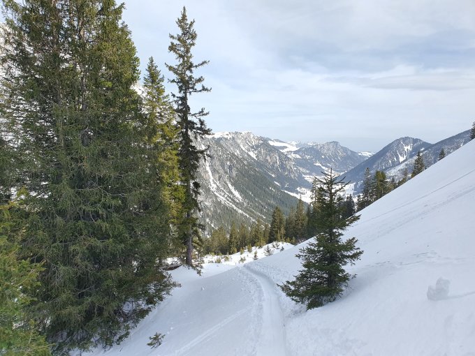 Im mittleren Abschnitt (bis zum Waldweg) sehr schwerer Schnee, aber gut machbar.