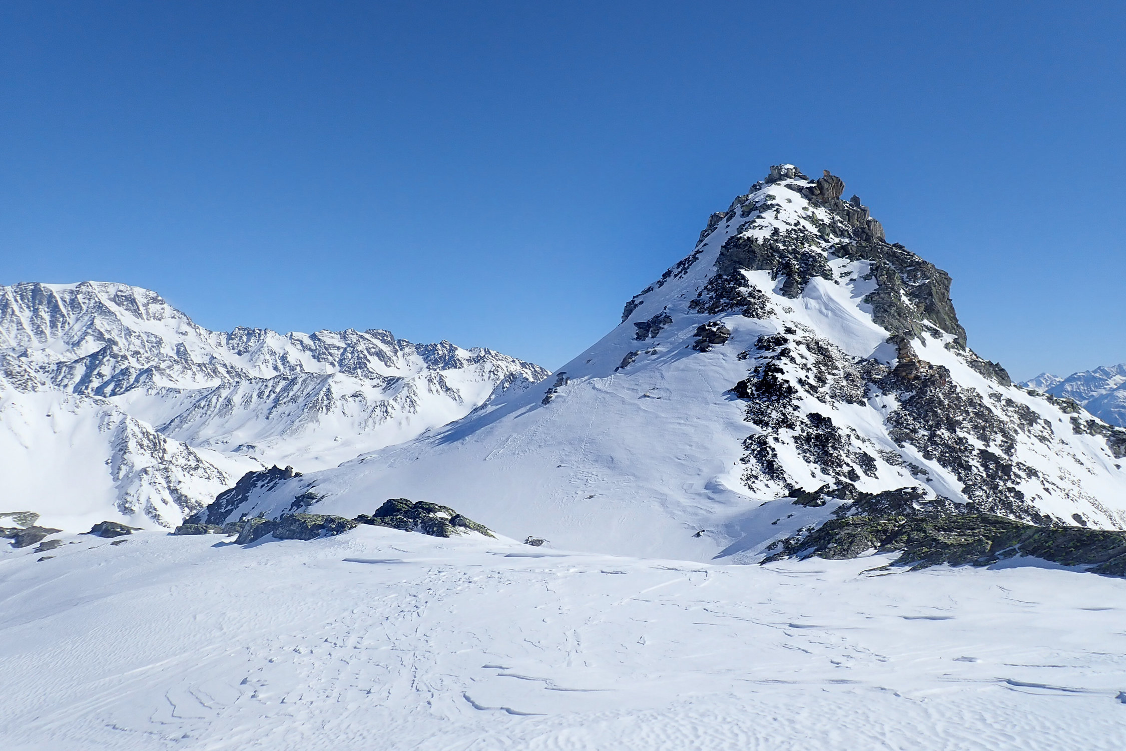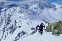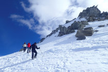 Zuerst vom Tunnelausgang auf italienischer Seite hoch zur Tête de Fonteinte (2774m). Grossartige Aussicht. Dann über den Grat absteigend (Steigeisen) zum Fenêtre de Ferret. Abstieg nach Süden in Nähe P. 2582. Dann Aufstieg Richtung Mont Fourchon und Querung zum Pain de Sucre. Gut machbarer Schlussaufstieg mit Steigeisen, da praktisch kein Neuschnee im Gipfelbereich.