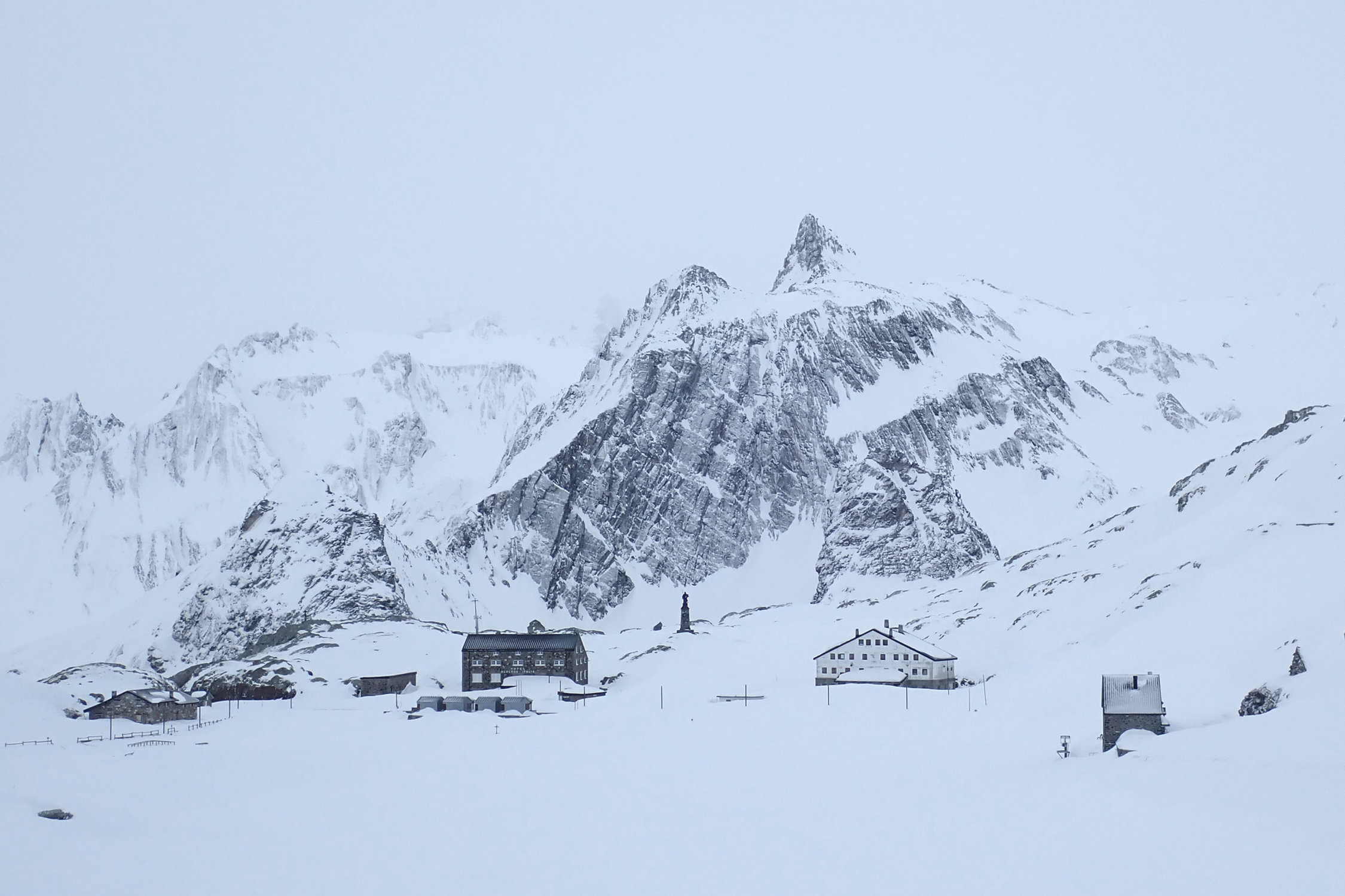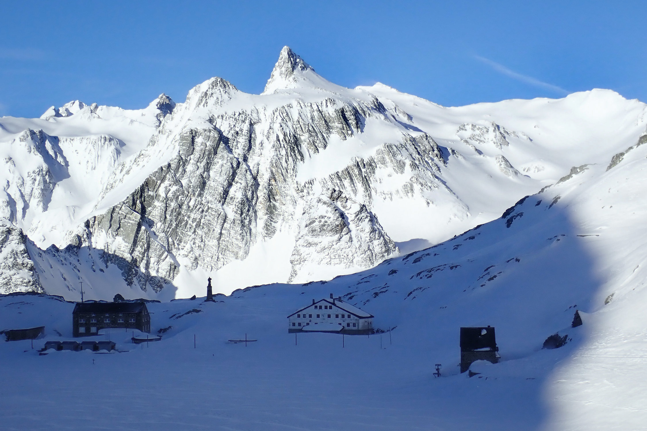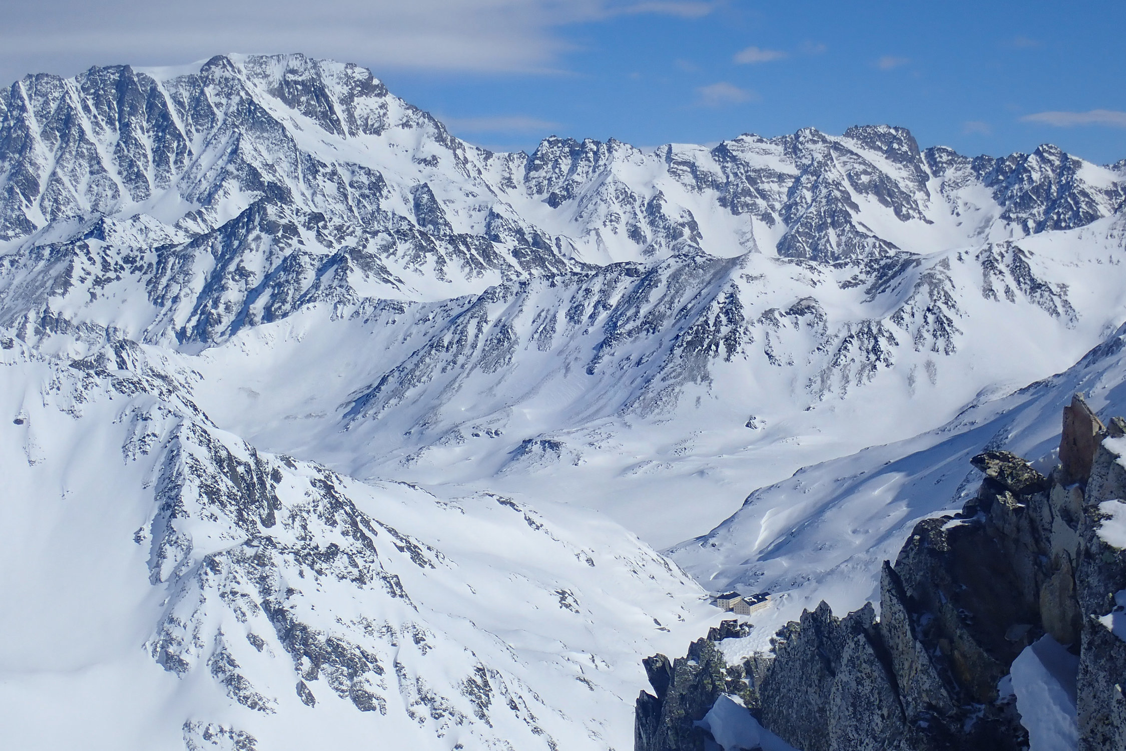 Das Hospice du Gr. St. Bernard ist ein schöner Ausgangspunkt für nicht allzu lange Ski- und Schneeschuhtouren. In den Mulden liegt viel Schnee. Wegen der verbreitet blankgefegten, eisigen Verhältnisse sind Steigeisen für die Gipfelaufstiege von Vorteil.