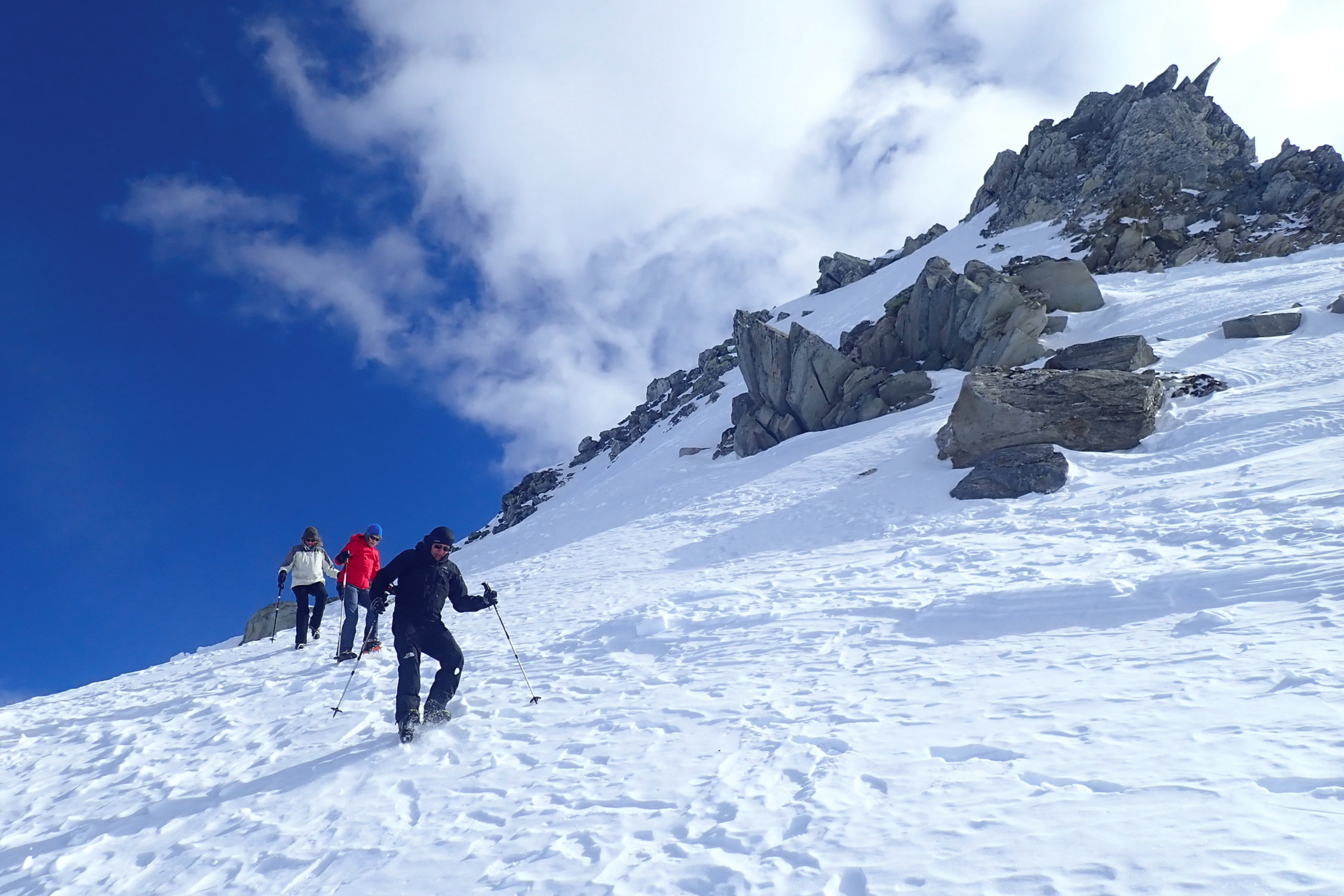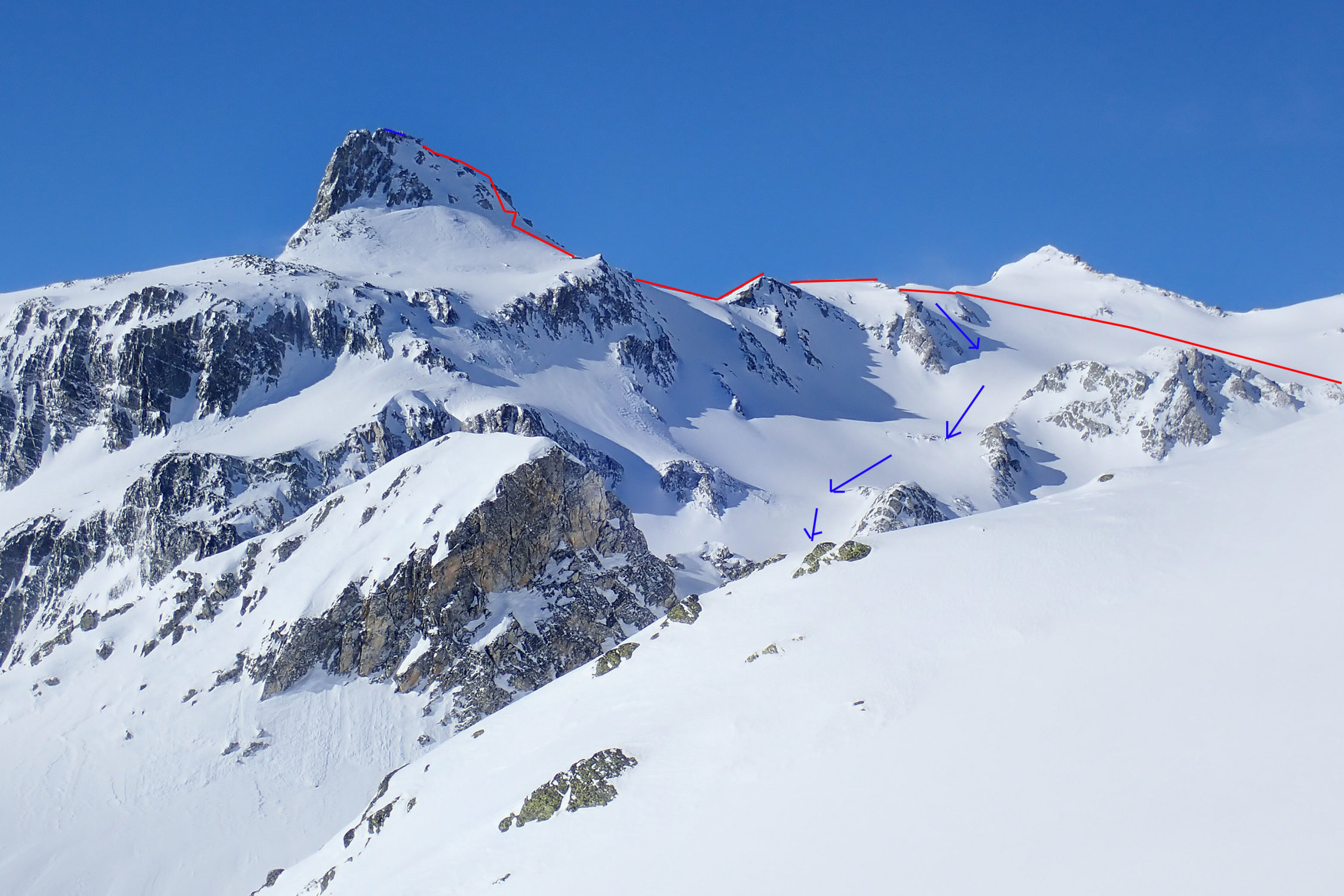 Gipfelaufstieg freigeblasen vom Neuschnee. Guter Trittschnee.