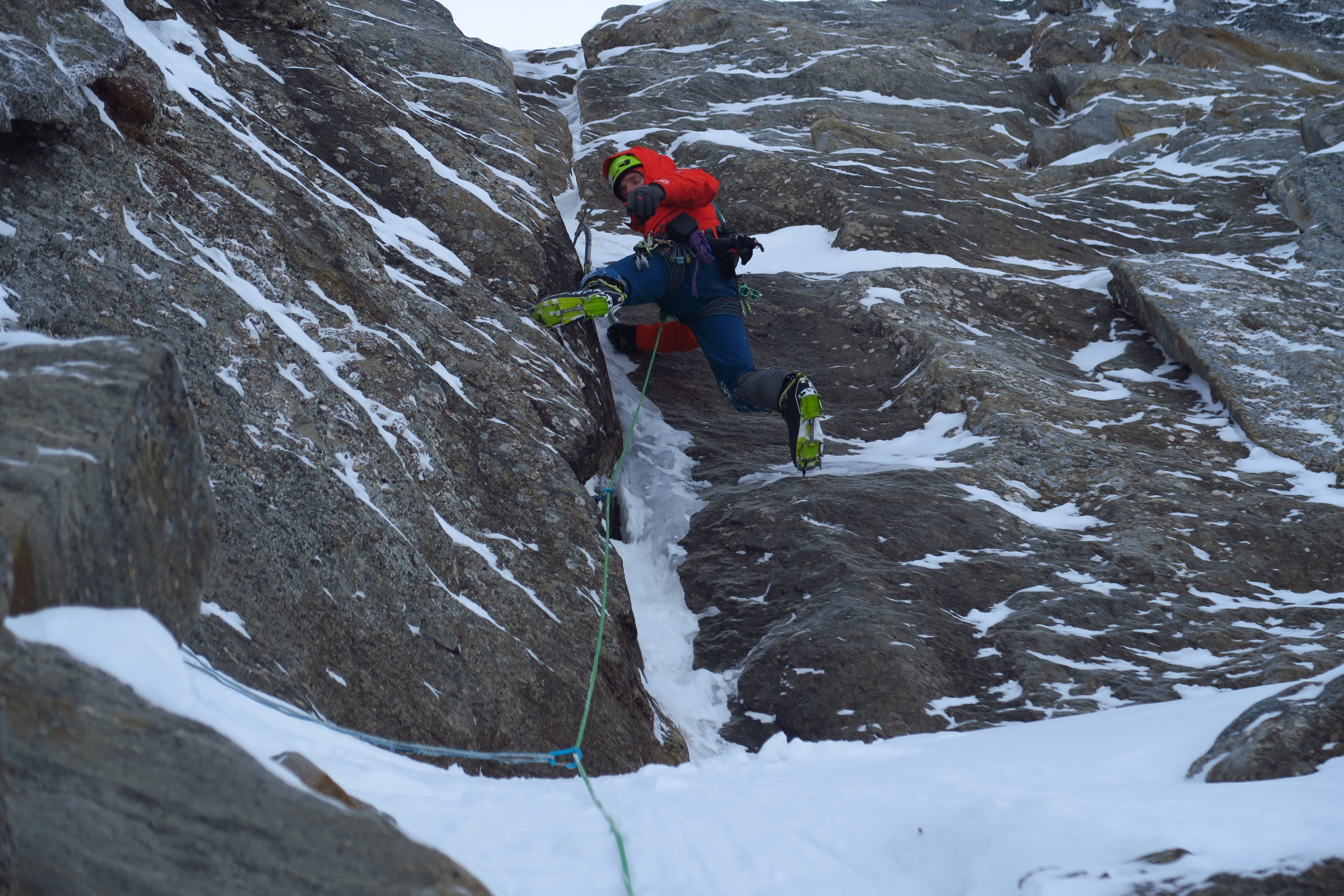 Wenig Schnee/Eis in der Wand, auf Zu- und Abstieg 20cm Neuschnee. Alles gespurt. Insgesamt im Vergleich mit der Alpennordseite sehr viel Schnee in der Region.