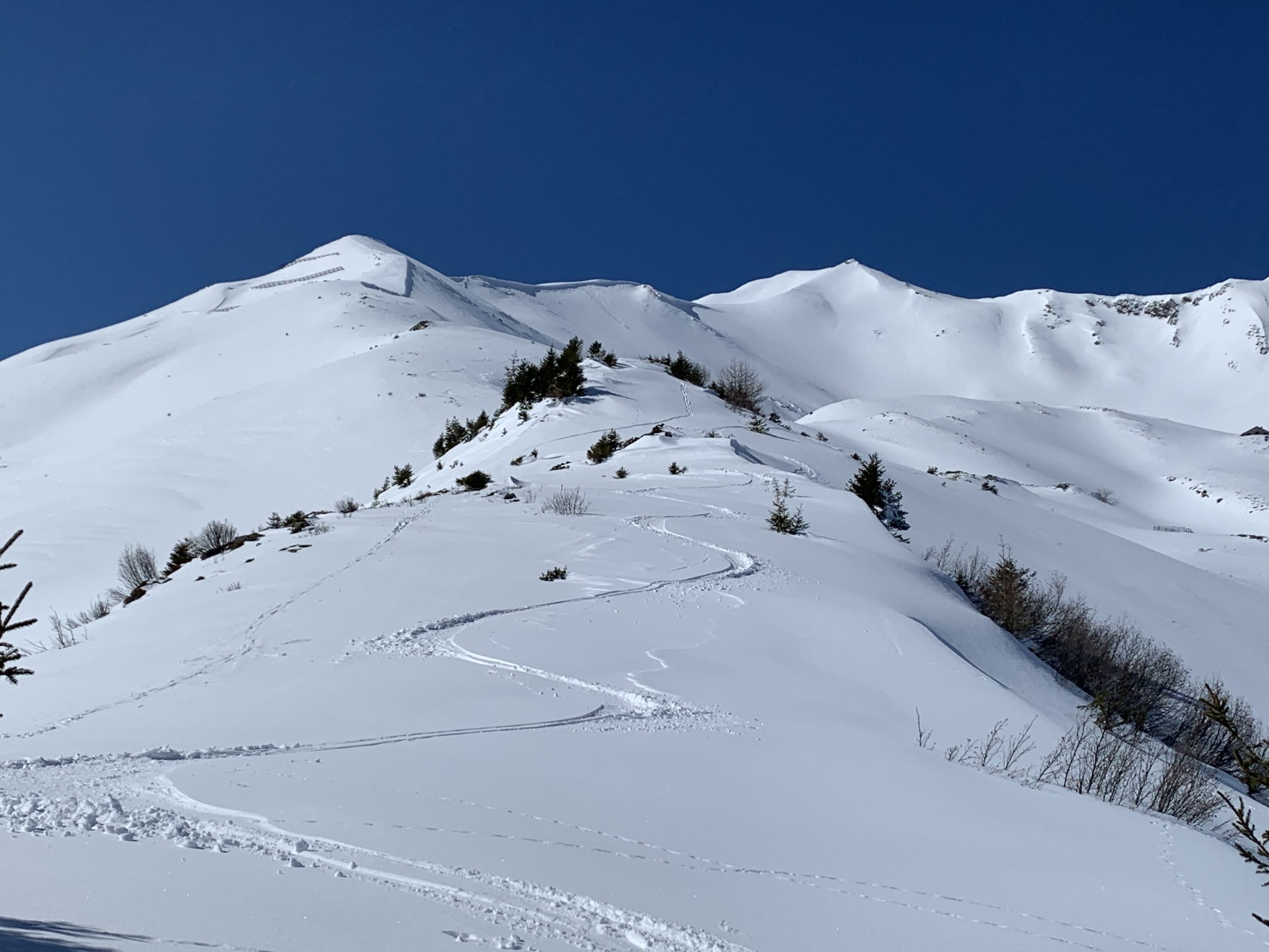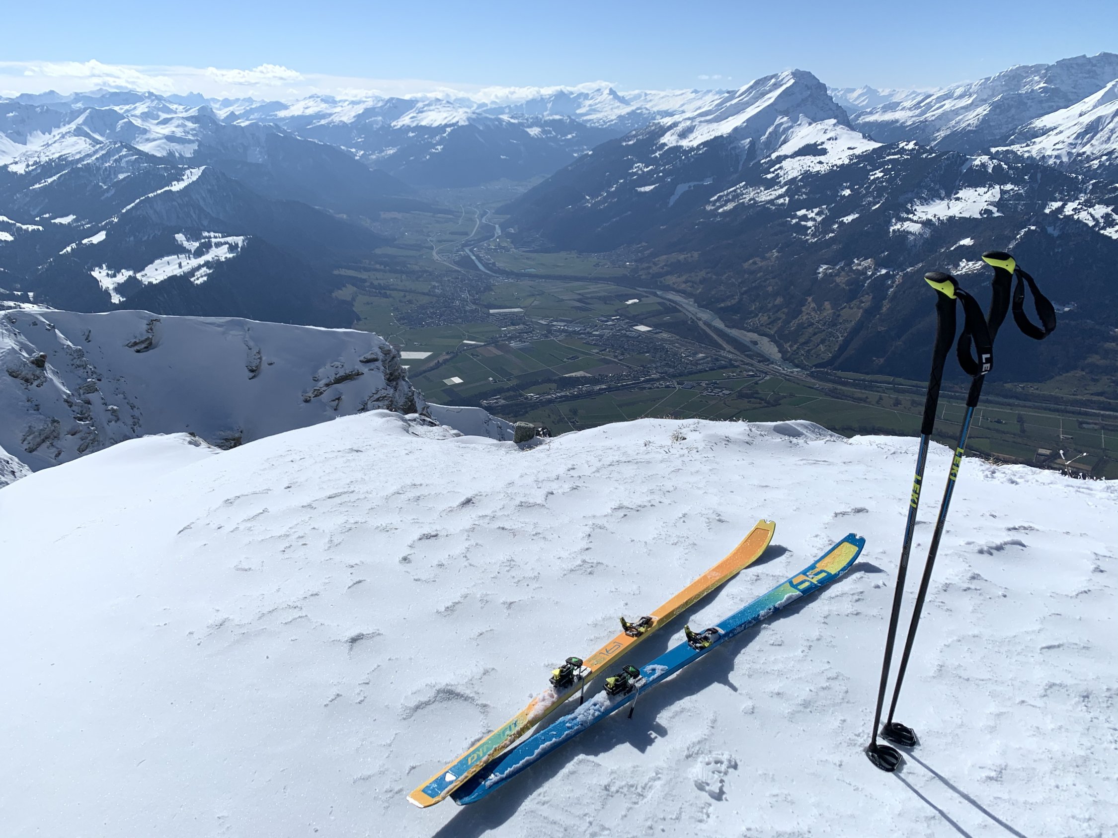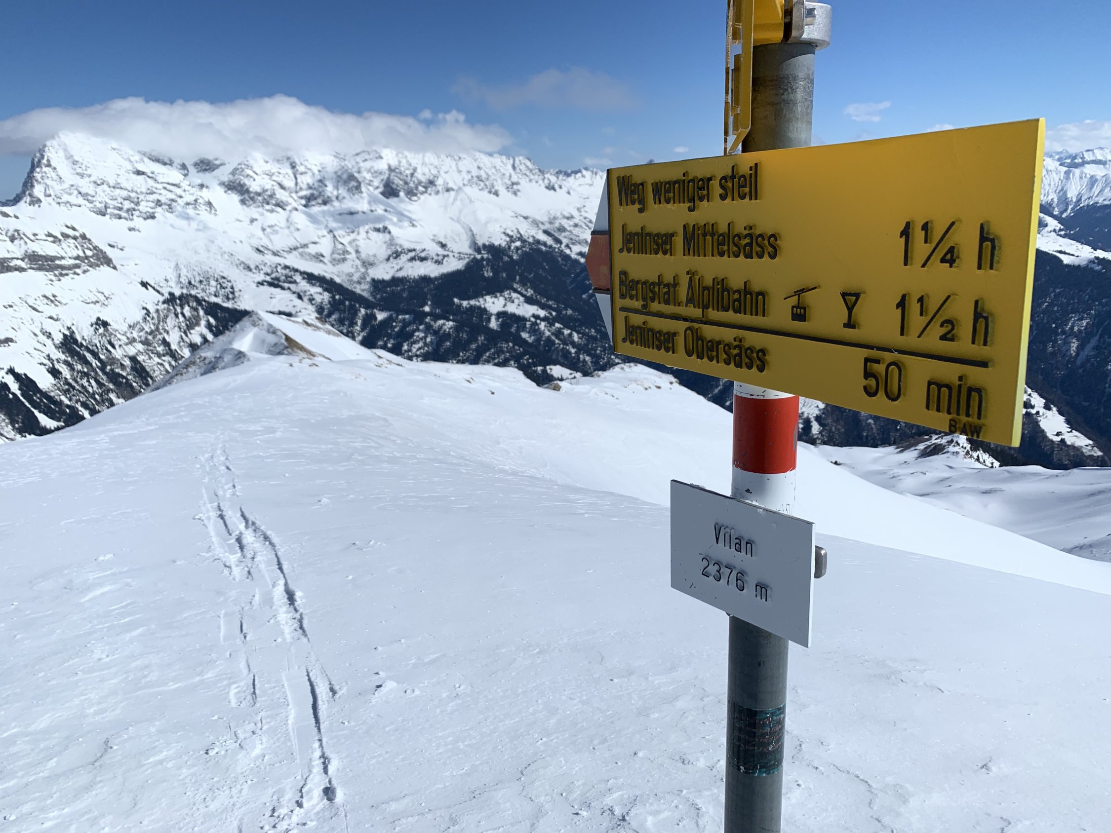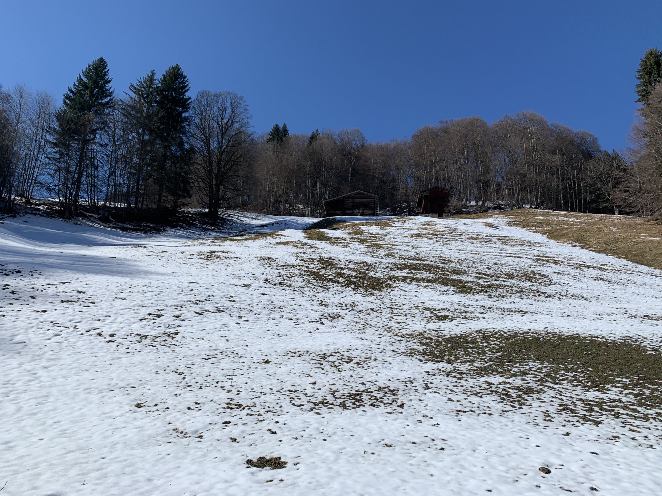 Parkplatz unterhalb Marnei 1043m benützt (Münzen mitnehmen). Ab da ging es heute auf sehr dünne Schneeauflage über Wiesen, Jerplan und weiter Normalroute hoch. Leider war der Schnee sehr klebrig bis auf 1700m (Stollen und Brems schnee). Schon schön an einem sonnigen Sonntag ganz alleine oben zu sein.