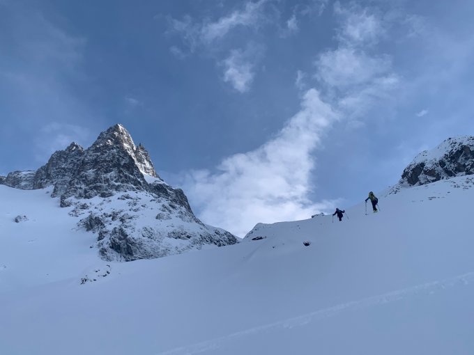 10-15 cm frischer Pulver auf der ganzen Route. Zuerst bedeckt, dann sonnig und recht warm. Schnee wird rasch schwer, aber wir hatten noch guten Pulver vom Gipfel bis zum Parkplatz.