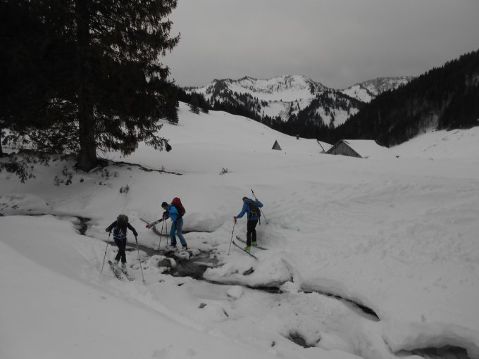 Trotz Föhnwärme hatte es gute Schneeverhältnisse. In den schönen Abfahrten gab es bei der Hohe Matona leicht windbearbeiteten Pulverschnee. Sonst hatten wir feuchten Lockerschnee, in dem sich wunderbar schwingen ließ. Der stürmische Wind machte sich bei der Hohen Matona bemerkbar und begleitet uns den Rest der Tour. Am Grat mussten wir uns gelegentlich gegen den starken Wind stemmen. Etwas bedeckter Himmel ließ diffuses Licht resultieren. Trotzdem - und vielleicht genau deshalb - durften wir wieder eine überaus reizvolle Tour in mittleren Höhen und Quasi vor der Haustüre erleben.