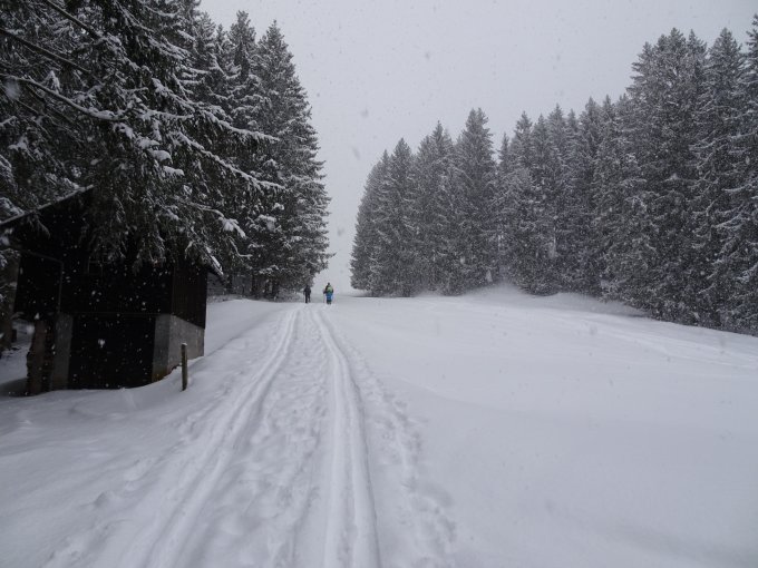 Start um 7:30 bei -2°C und, entgegen den Prognosen, bewölkt und dann einsetzender Schneefall.