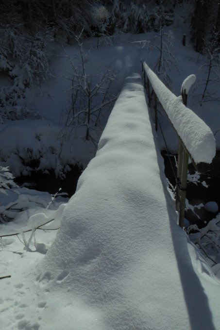 Bei Start um 10 noch stark bewölkt mit zunehmender Auflockerung, ab Mittag sonnig. Forststrasse noch genügend bedeckt, dass ab P am Rand die Ski benutzt werden konnten. Ab Abzweig vor den Jagdhütten musste ich bis Gipfel spuren. Im Wald zur Kälberhütte hoch einige Behinderungen durch Sturmholz. Ab Waldrand dann kompakter Pulver bis Gipfel, alles unverspurt die komplette Nordseite. Top Verhältnisse in der Abfahrt, so dass ich am Pkt.1374m(Abzweig Schnitzleralp) wieder anfellte und noch mal hochstieg. Wenn schon jetzt Spur vorhanden, um ein 2. mal den oberen Teil zu geniessen. Im Wald unterhalb Kälberhütte wurde der Schnee dann etwas knapp und schwer. Der Rest in der Aufstiegspur dann kein Problem, sogar das schmale Brückle konnte ich heute flott durchfahren.