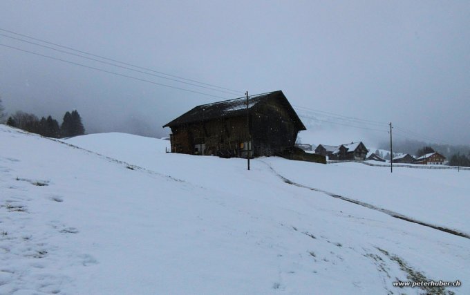 Bedeckt, oft leichter Schneefall, kuzre Aufhellungen zwischendurchg. In der oberen Hälfte kalter Wind. Es hat genug Schnee ab dem Start. Es liegen ca. 10 cm feuchter Lockerschnee auf guter Unterlage. Ab ca. 1400 m hat es erstaunlich viel Schnee, wenn auch durch den Wind unregelmässig verteilt. Oben ca. 10 cm gepresster Pulverschnee.