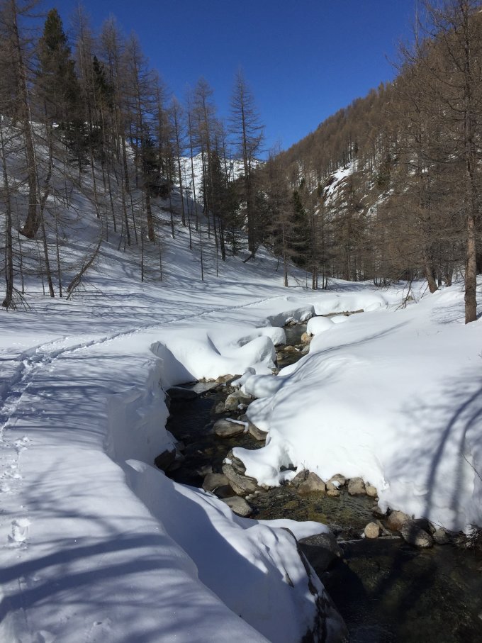 (Begangen als Schneeschuhtour, ab Almagell). Ziemlich wechselhafte Schneeverhältnisse - unten im Wald ein wenig neuer Pulverschnee, weiter oben oft tragender Deckel. In Kammnähe oft pickelhart. Sturmwind am Kamm, daher nur bis zum Cresta- Biwak gegangen (ca 3020 m). So gab‘s immerhin eine windgeschützte Rast.