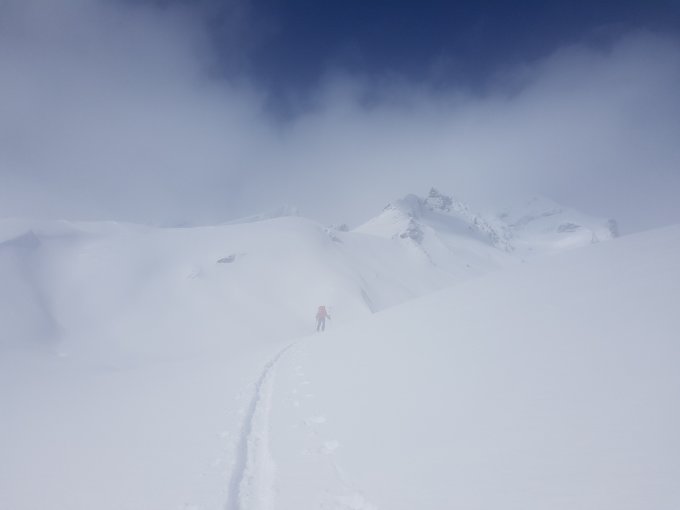 Durchgehend Pulverauflage zwischen 10 und 30 cm, je nachdem, wo es reingeblasen hat. Da die Route relativ windgeschützt ist, wenig verblasen und kein Triebschnee. Sind nur bis zum Pass (Wart, P 2705)) gegangen. Von dort bis zum Gipfel war der Schnee praktisch weg, alles verblasen. Hätte man zu Fuss machen können.