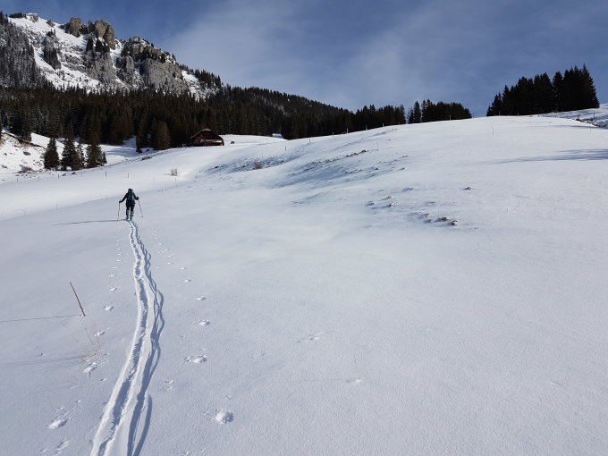 Mit dem Auto konnten wir bis zum Blattweidli fahren. Wir parkierten in der Hegi Kurve und konnten bereits nach 100 Meter durchgehend mit Ski weitergehen. Da wo der schöne Teil der Tour eigentlich erst beginnt.