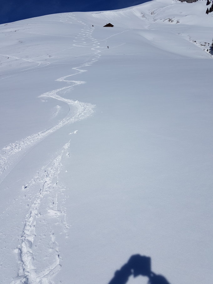 Und siehe da: fast alleine am Berg (nur 2 weitere), unverspurte Hänge rauf und runter und ausser krassem Schneemangel beim Gipfel Pulver und Sulz. Und gegenüber am Menigrat tummelten sich gefühlt 100....