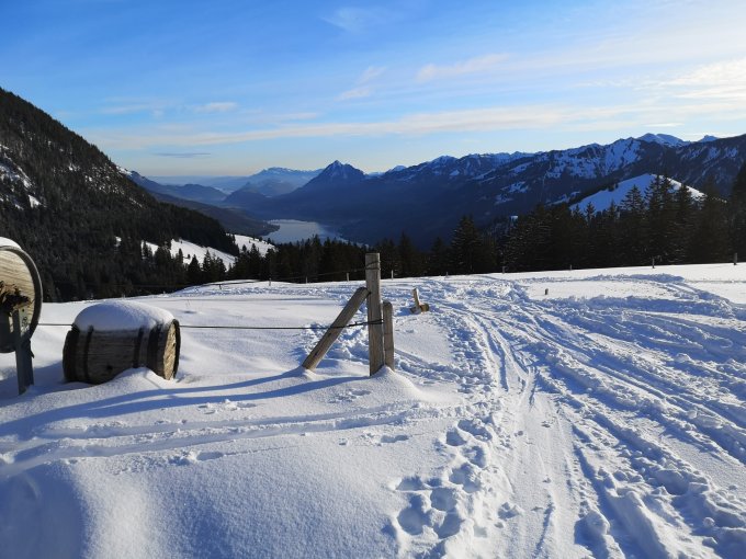 Die ersten 20 Minuten die Skis getragen und dann sehr gute Verhältnisse bis zum Gipfel. Wunderbarer Pulver auf der Abfahrt bis zur Brosmatt-Hütte.