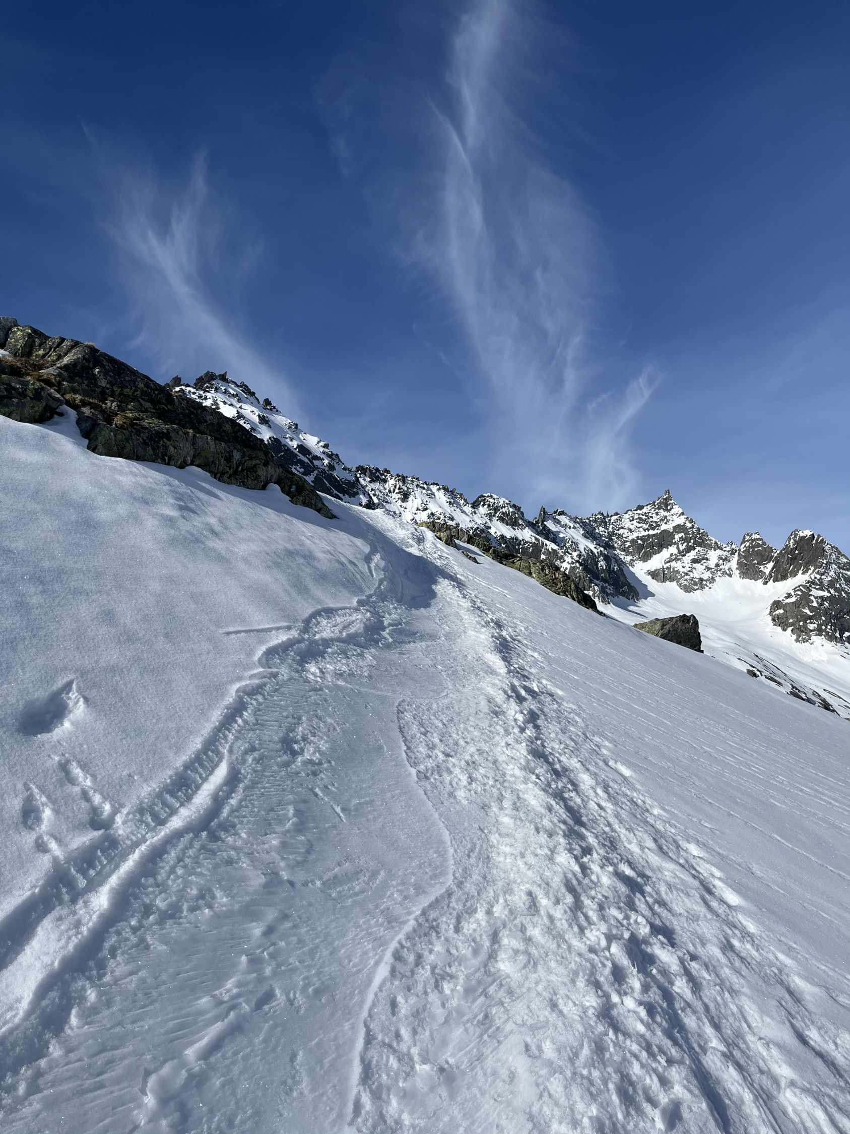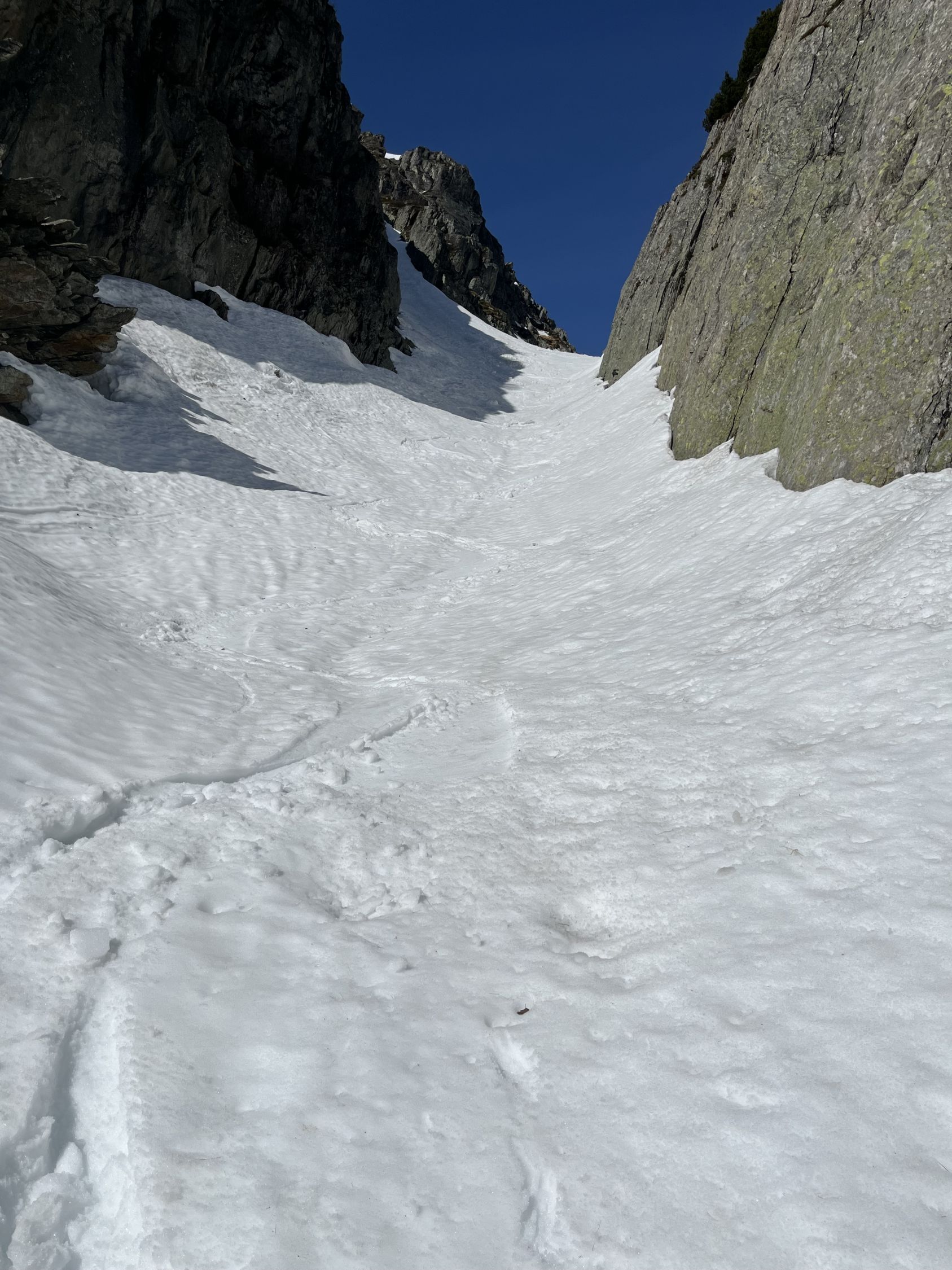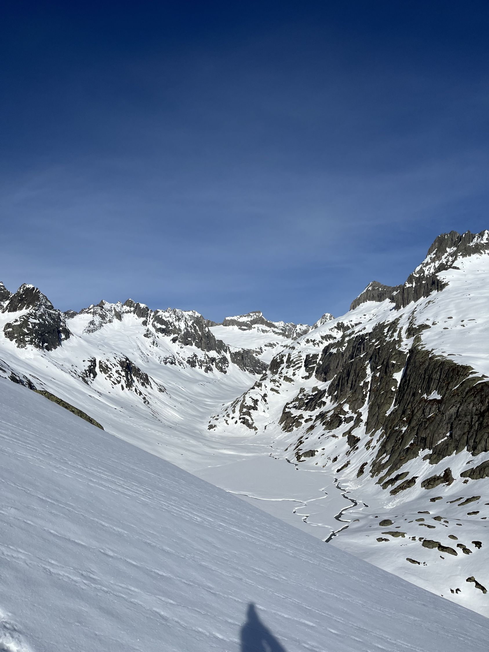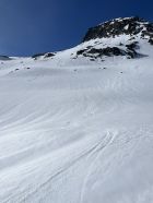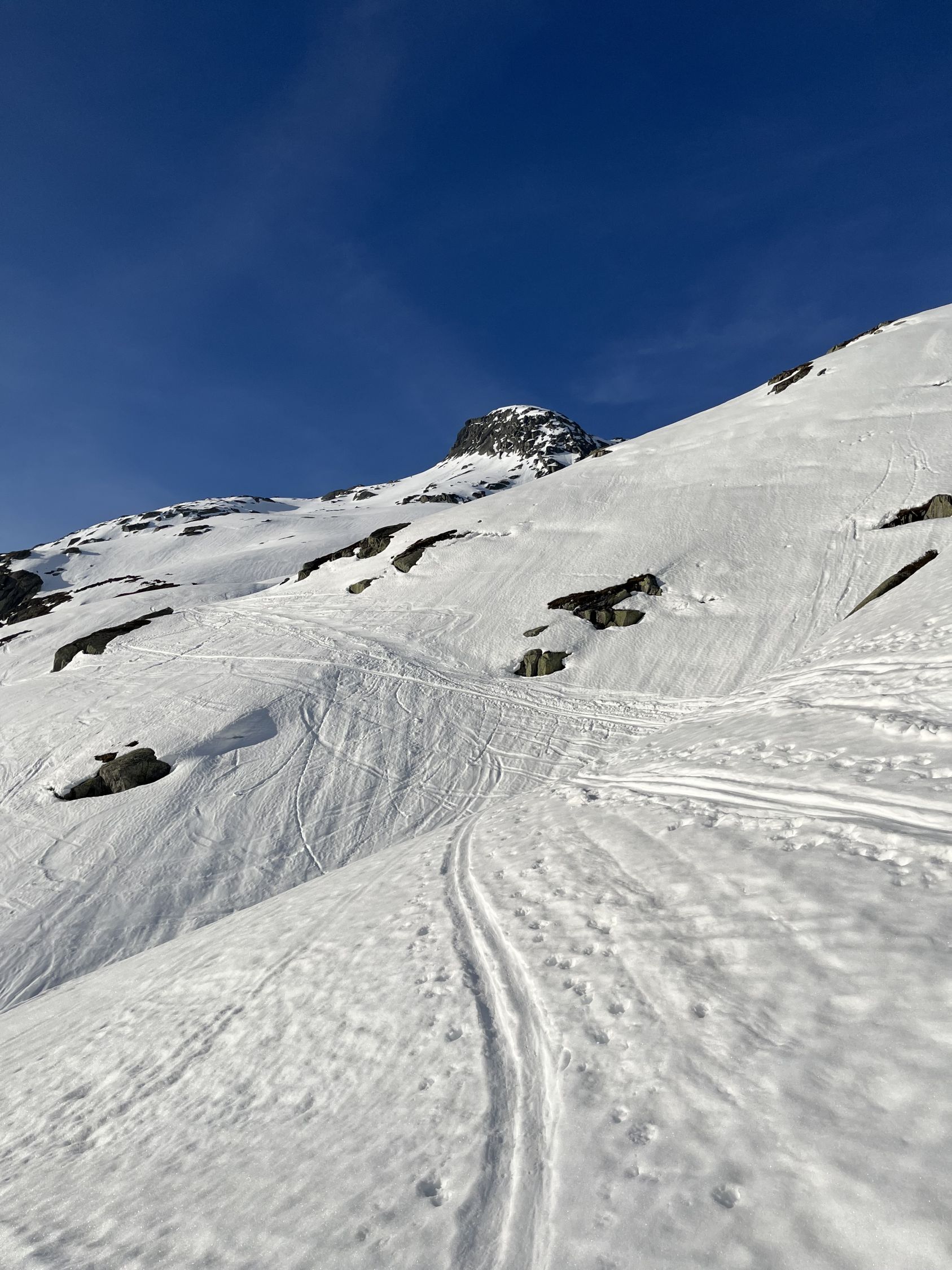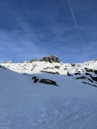 Grimselpassstrasse ist bis Rätrichsbodensse offen. Der Parkplatz war voll mit Autos. Es haben schon Autos weiter unten parkiert. Bin um 7.15 Uhr gestartet. Die meisten (über 20 Personen) waren Richtung Alplistock unterwegs. Andere gingen Richtung Gärstenlücke. Ich war alleine Richtung Juchlistock unterwegs. Als ich abgefahren bin, kamen noch zwei Türeler. Der Schnee war gut durchgefroren und deshalb sehr angenehm zum Aufsteigen. Die Aufstiegspur wäre gut angelegt. Leider ist jemand über die Aufstiegspur abgerutscht. Vermutlich war gestern Nebel und die Person konnte sich so besser orientieren. Im oberen Teil waren Harscheisen hilfreich. Das Gipfel Couloir ist gut eingeschneit mit Trittspuren. Steigeisen und Pickel sind hilfreich. Auch der Fels zum Klettern war angenehm trocken. Traumhaft schöner Ausblick auf dem Gipfel. Es war windstill und angenehm warm. So gab es einen ausgiebigen Gipfelrast. Abfahren um 10.00 Uhr war perfekt. Eine halbe Stunde später könnte auch noch gehen. Das untere Couloir mit dem Bach, hat noch sehr viel Schnee. War wunderschön zum fahren. Der Lawinenkegel unten, kann rechts umfahren werden. Es war ein traumhaft schönes Türli. Zum Mittagessen wieder in Spiez.