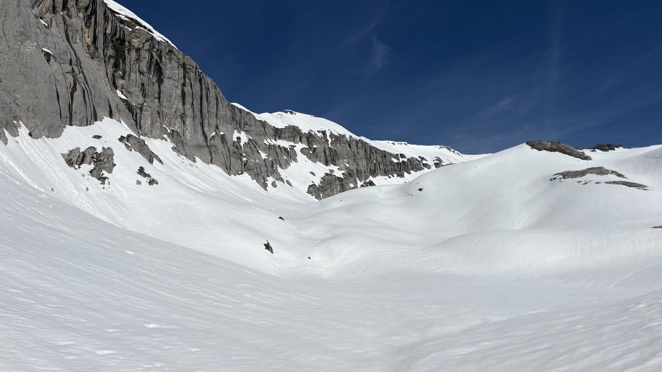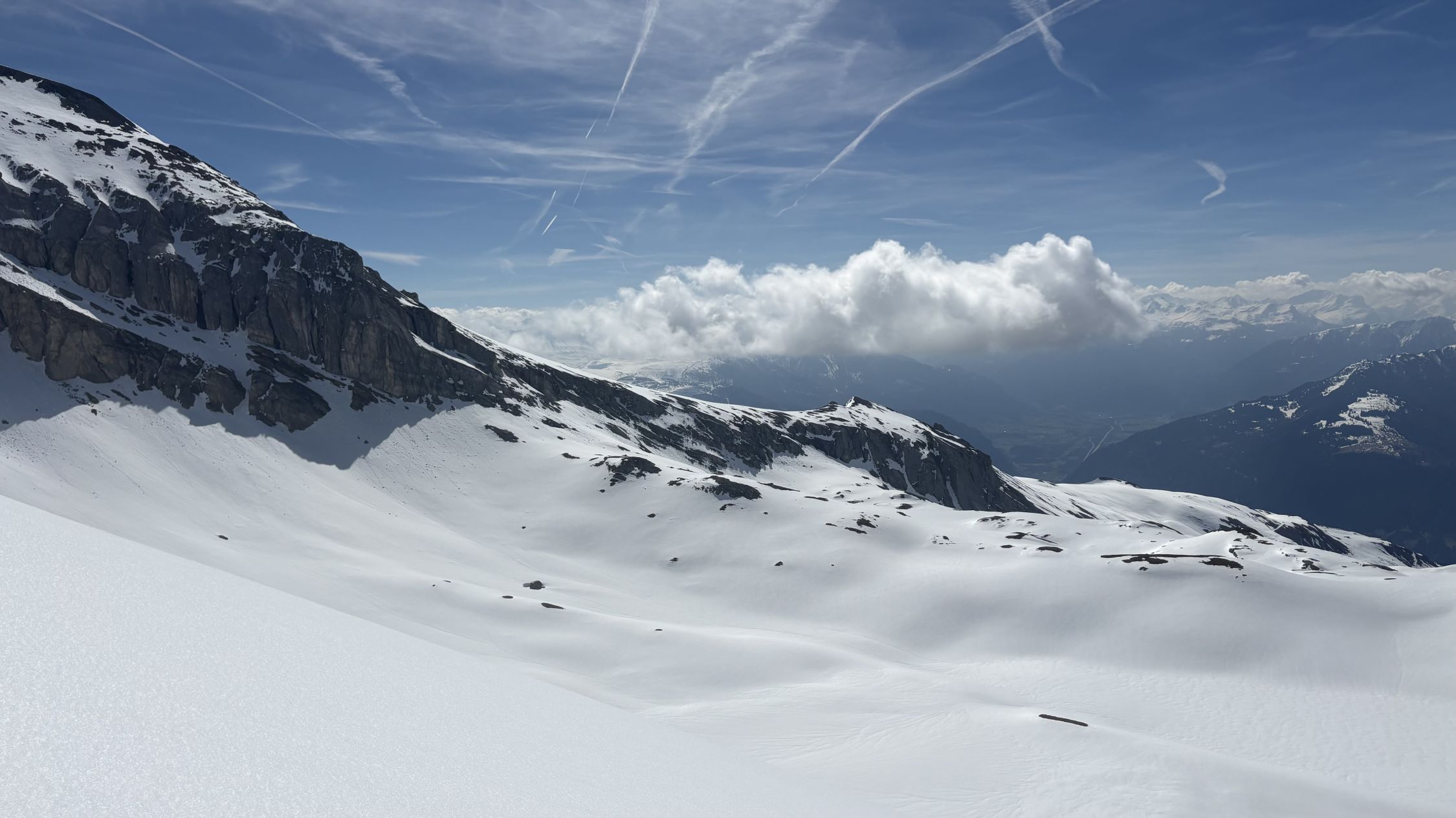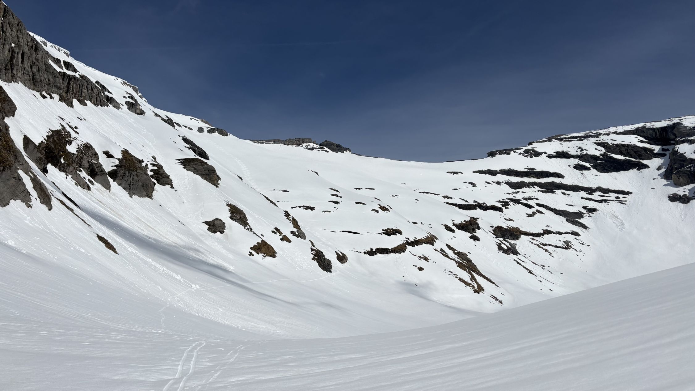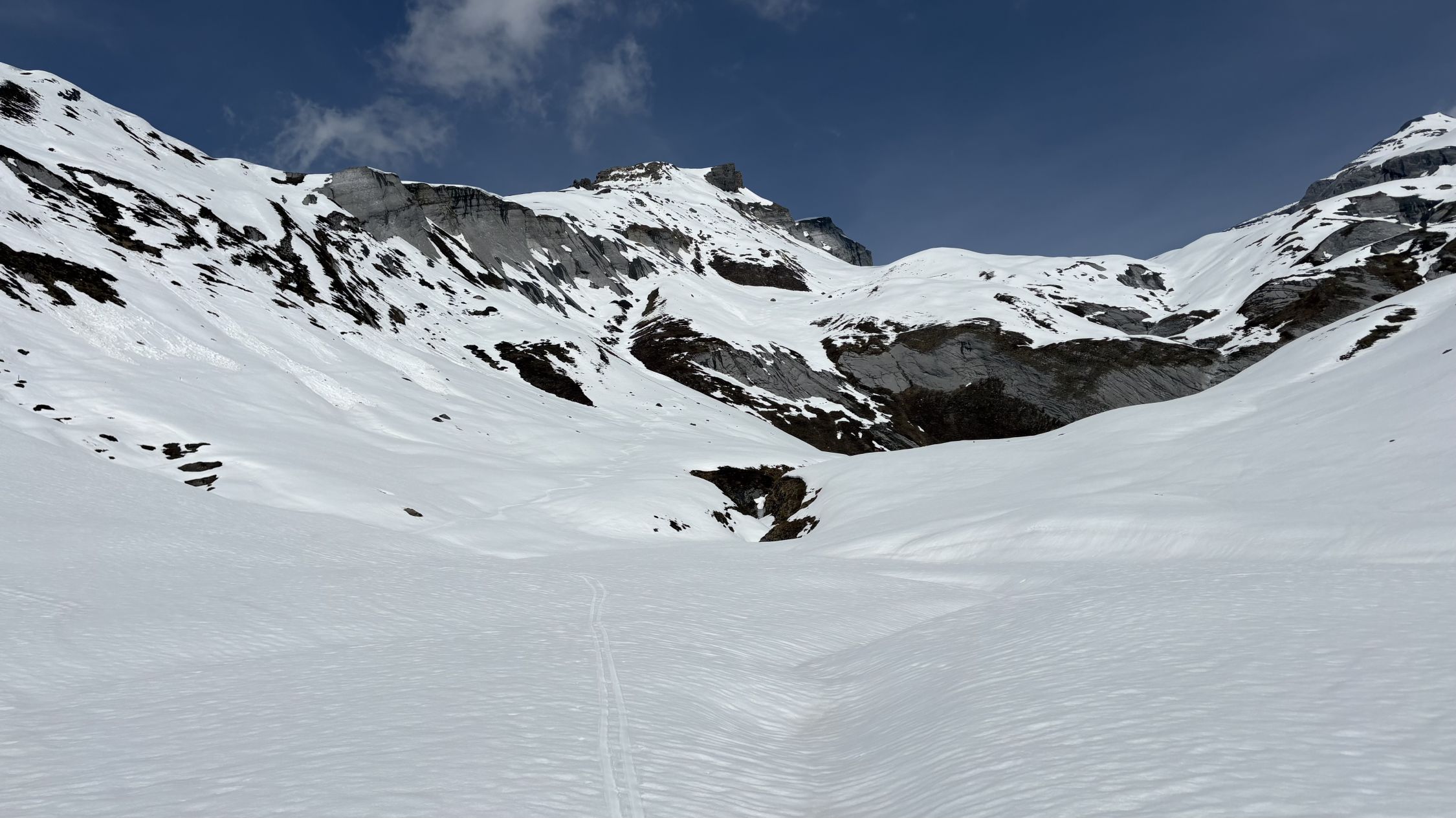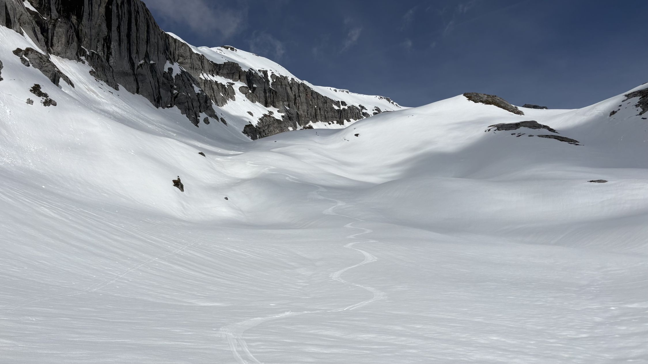 Bewusst, dass ich etwas spät dran war, erstaunte mich, dass nur eine kurze Passage oberhalb der Alp etwas „eierschalig“ war, d.h. vorsichtiges Drehen, damit die Skier nicht durchbrachen.