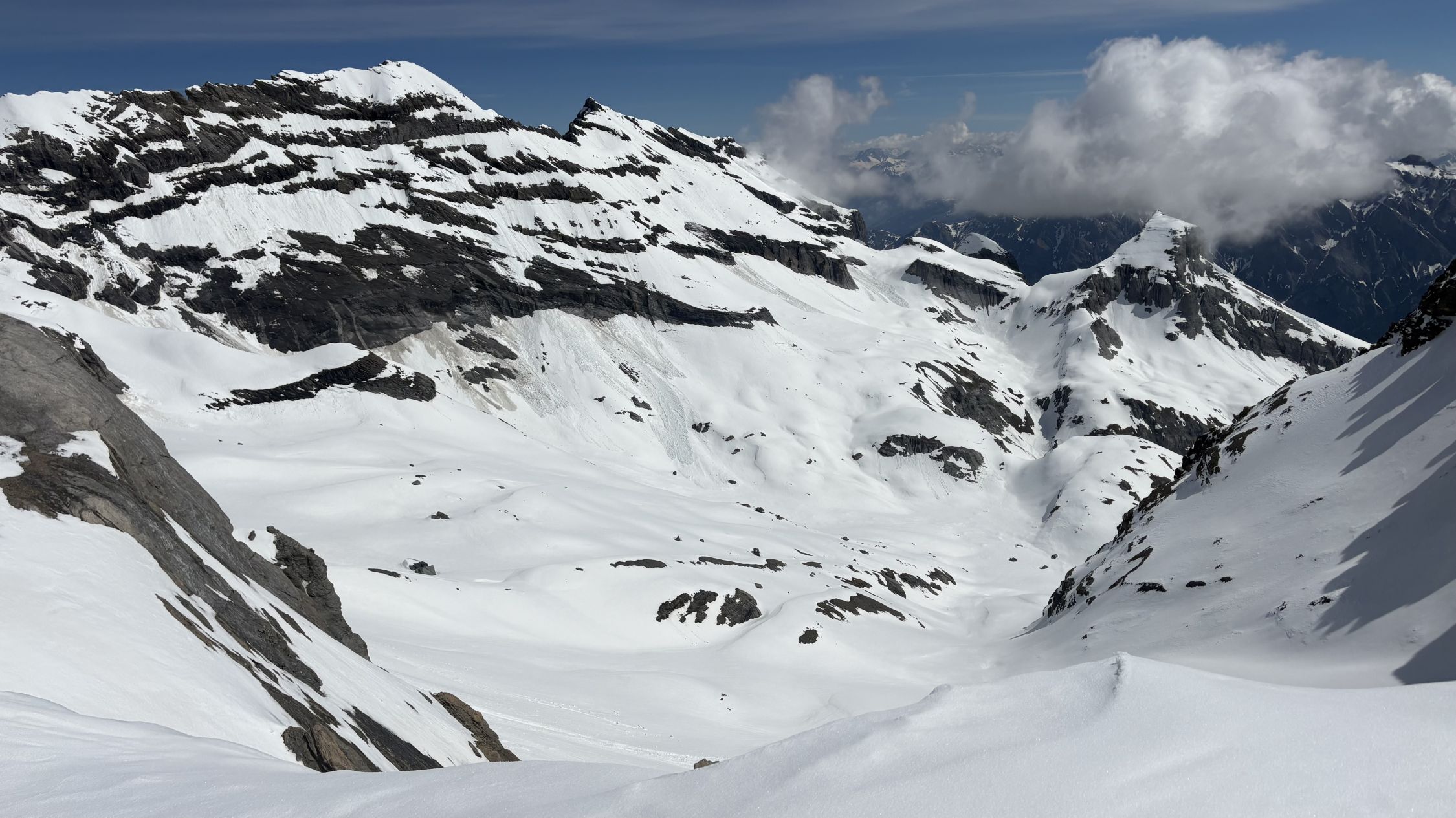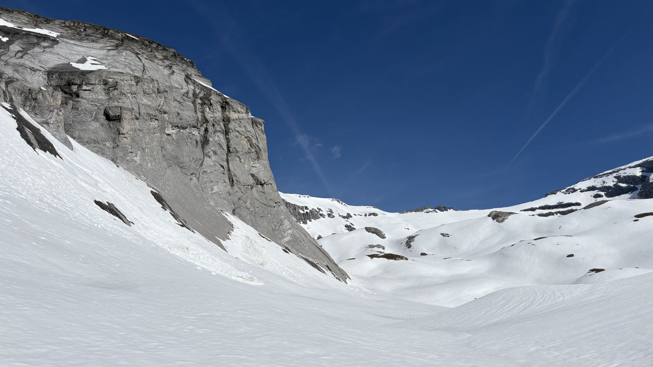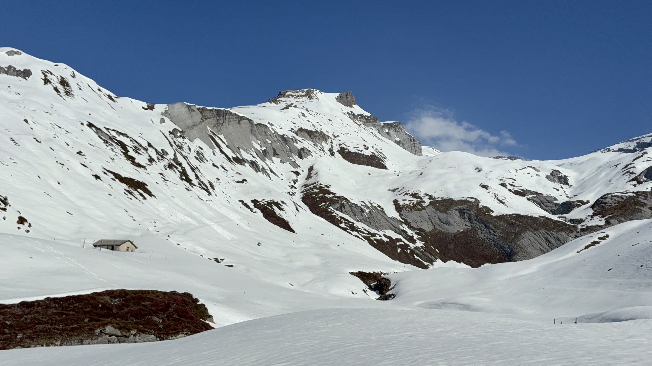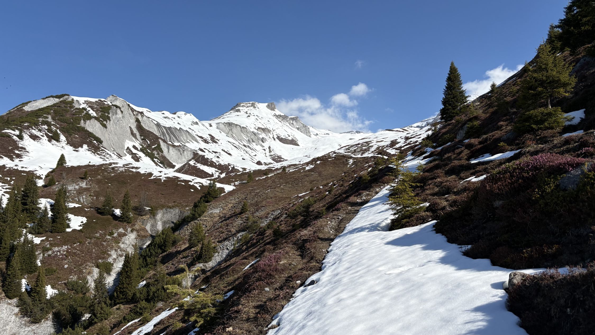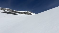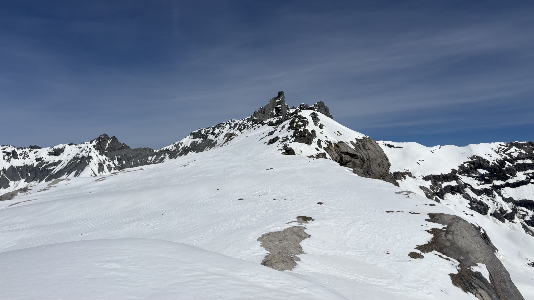 Bewusst, dass ich etwas spät dran war, erstaunte mich, dass nur eine kurze Passage oberhalb der Alp etwas „eierschalig“ war, d.h. vorsichtiges Drehen, damit die Skier nicht durchbrachen.
