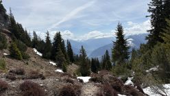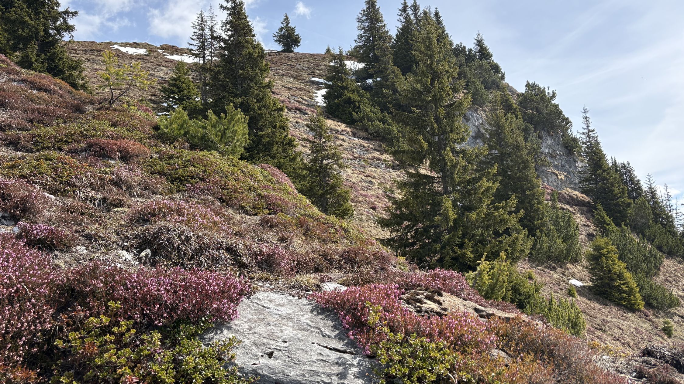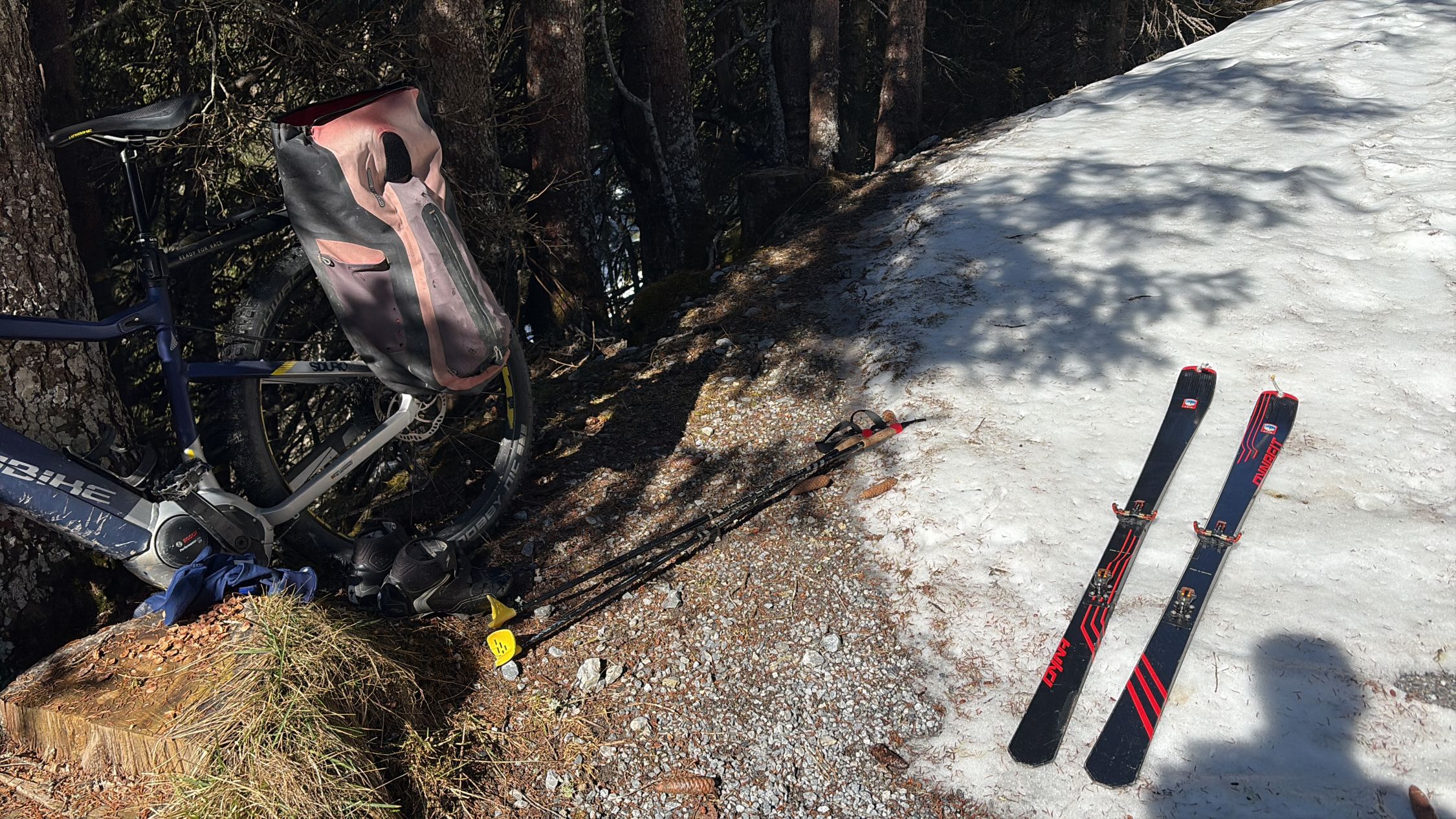 Durch den Wald wandernd waren es vom Skiabschnallen (Höhe 1850) nur noch ein kurzes Stück zum E-Bike.
