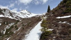 Durch vereinzelte Schneefelder gelangt man kurz unterhalb der letzten Haarnadel auf 1760 müM zum Bikedepot.