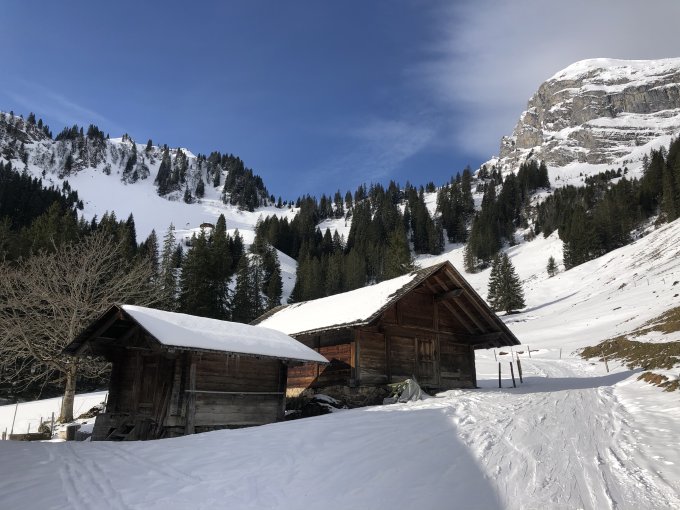 Unterhalb ca. 2000m bis ca. 1400m 5-10cm Pulverschnee auf harter Unterlage, ebenfalls schön zu fahren. Weiter unten dann dünn, gerade noch genug, um zurück zum Ausgangspunkt zu gelangen. Dieser befand sich heute kurz vor der Abzweigung der Gurbsgrat-/Cheibehornroute (Pkt. 1205), wobei die Strasse für 4x4- und unerschrockene Fahrer bis zu den Alphütten bei Pkt. 1357 passierbar war.