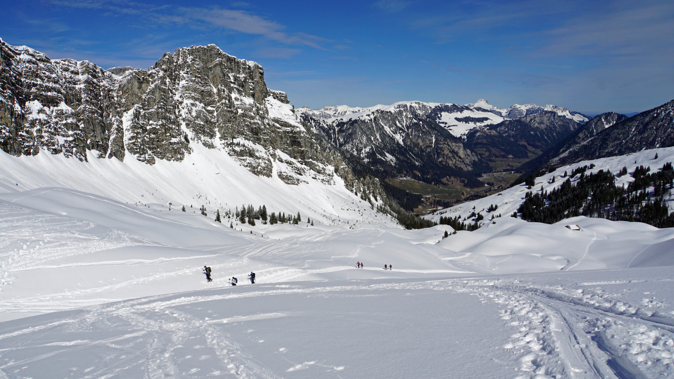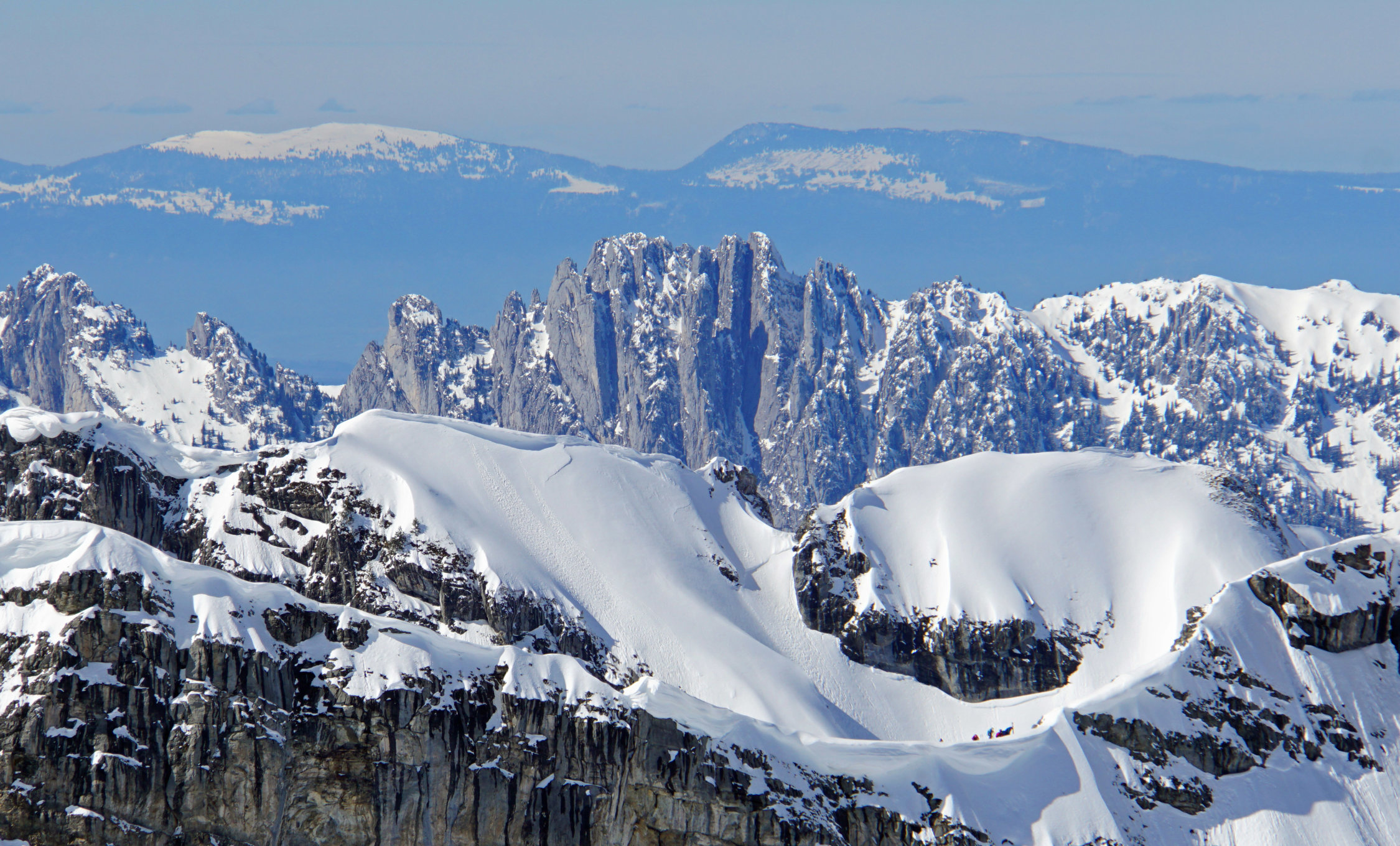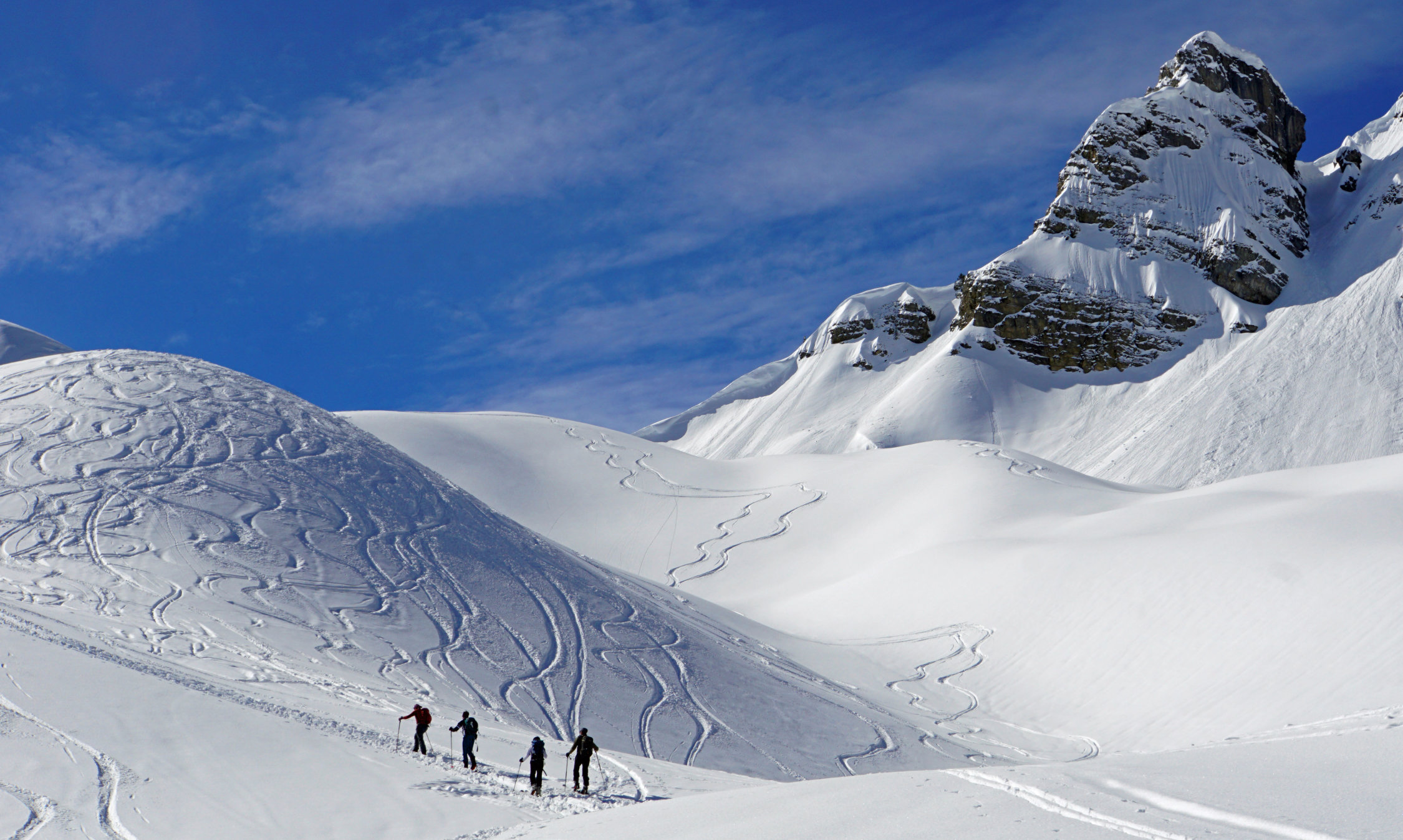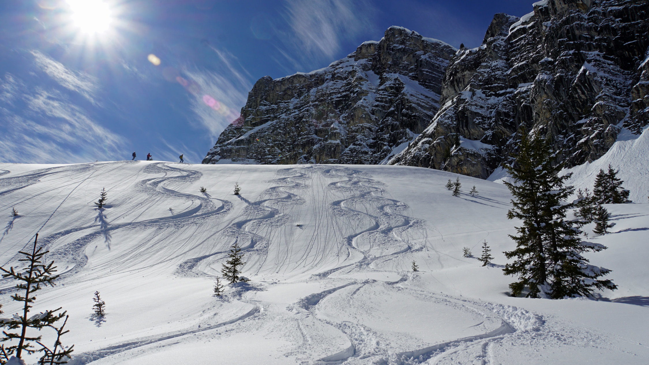 Zum glück hat es geschneit und oberhalb von Zirka 1500m konnte man feststellen, dass die Schneedecke beachtlich ist. Trotz vielen Tourengänger gab es noch Platz für neue Abfahrtspuren im besten Pulver!