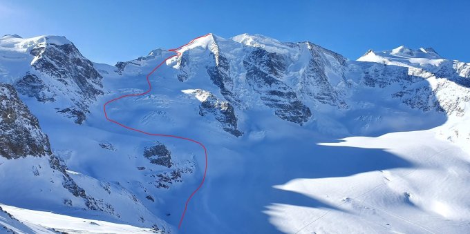 Ab Diavolezza Bergstation gestartet. Die Cambrena Brüche und der gesamte Gletscher sind sehr gut eingeschneit. Bis 3729 (Skidepot) kann Problemlos mit den Skiern aufgestiegen werden. Wenn man sich nicht ganz sicher ist, sind auf den letzten 50hm mit den Skiern Harscheisen von Vorteil, da diese Stelle abgeblasen und glasig ist. Ein Ausrutscher würde wohl in der grossen Spalte (3700) enden.