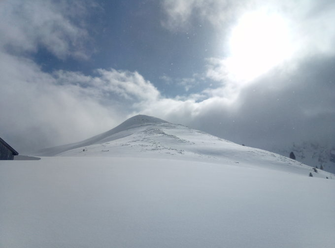Bei einem Gemisch aus Schneefall und sonnigen Momenten ein feines Nachmmittagstürli. Unten feuchter Neuschnee weiter oben windgepresster Pulver, alles gut zu fahren.