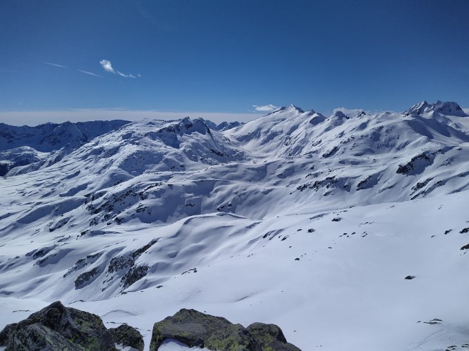 Überwältigende Aussicht vom Gipfel. Ich war positiv überrascht. Im oberen Teil vom Aufstieg und auf dem Gipfel herrschte mässiger bis starker Wind. Aufgrund der hohen Temperaturen lag dennoch eine gemütliche Pause drin. Das Wetter war traumhaft. Auf der Abfahrt wurde es schon fast richtiggehend heiss... zu heiss für die Jahreszeit. Leider habe ich mit dem Handy nur Bilder vom Gipfelpanorama gemacht und keine eigentlichen Verhältnisbilder.
