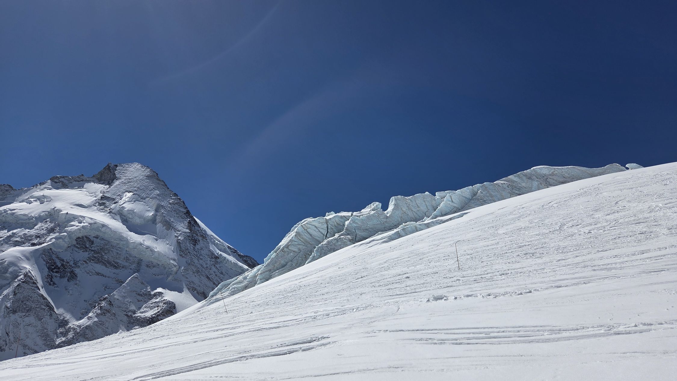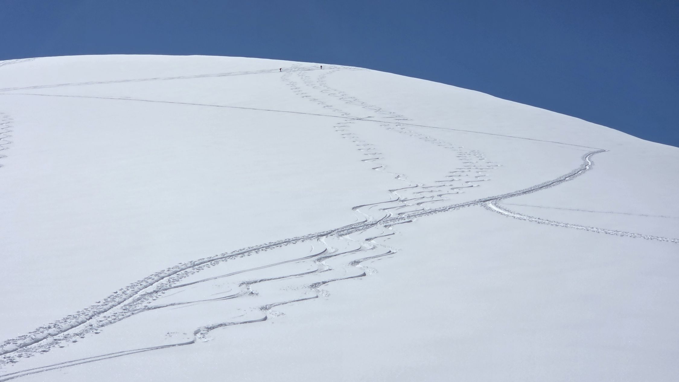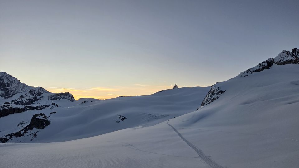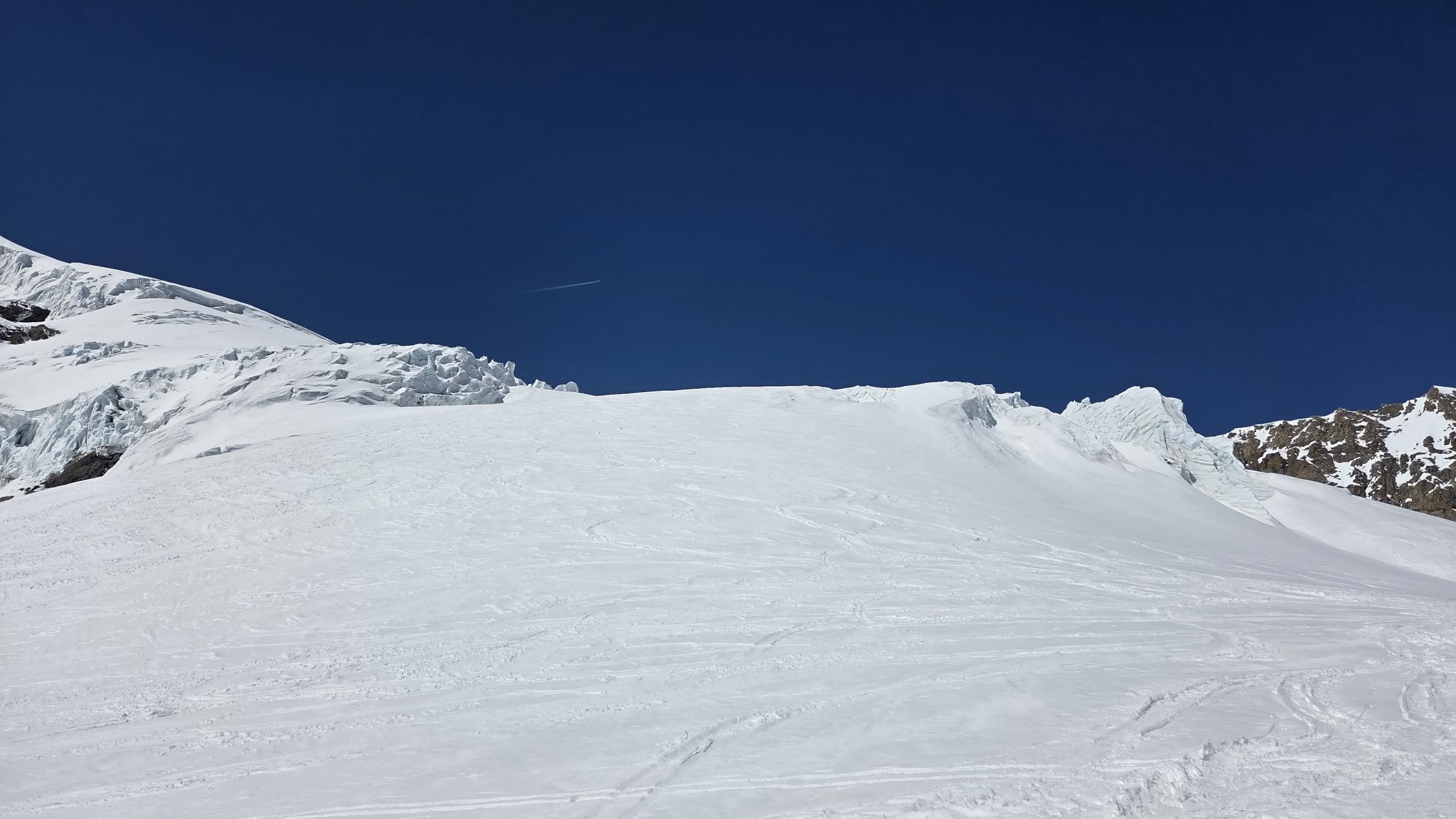 Die Abfahrt zurück zum Col de Valpelline war das absolute Highlight des an Highlights nicht gerade armen Tages. Pulver pur, und viel Platz für eigene Spuren. Selber Schuld wer sich das entgehen lies (fast alle!). Der Pulver ging dann relativ schnell in Sulz über, was ebenfalls ein Genuss war bis ca 2400m. Ab da der Moräne entlang - meist auf Schnee - zur Stafelalp. Ab dort auf der weichen Piste weiter bis nach Zermatt.