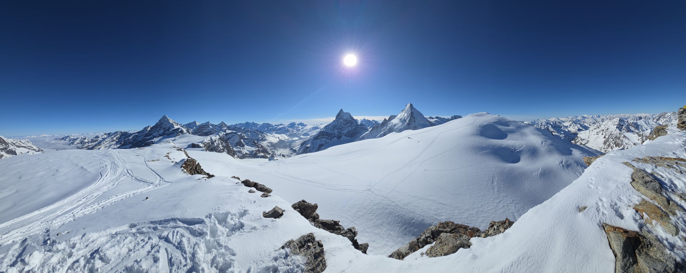 Die ersten Abfahrtsmeter zur Col de Valpelline waren schöner Pulver, wenn auch nicht mehr unverfahren. Von da auf super Spur hoch zur Tête de Valpelline, wo es eine ausgedehnte Pause bei herrlicher Aussicht gab.
