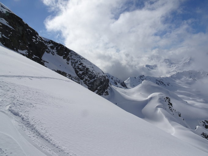Schneeverhältnisse: oberster Teil etwas Neuschnee auf harter bedingt tragender Schicht. Mittlerer Teil feuchter sehr gut zu fahrender Schnee. Letzten ca. 300HM dann ganz leichter Bruch. Pulver gabs keinen, nicht mal auf einer Höhe von 2800m.